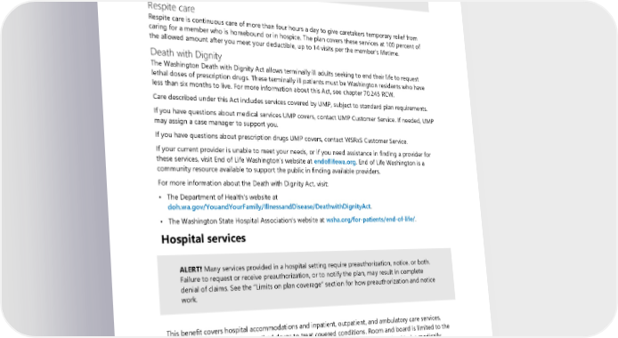 ALERT! The member pays the full cost for noncovered prescription drugs. If the member purchases covered prescription drugs from a non-network pharmacy, the plan pays under the normal prescription drug benefit as described in the “What you pay for prescription drugs” section. Prescriptions purchased from an excluded pharmacy will not be covered. See the definition of “Excluded pharmacy.” Respite care Respite care is continuous care of more than four hours a day to give caretakers temporary relief from caring for a member who is homebound or in hospice. The plan covers these services at 100 percent of the allowed amount after you meet your deductible, up to 14 visits per the member’s lifetime. Death with Dignity The Washington Death with Dignity Act allows terminally ill adults seeking to end their life to request lethal doses of prescription drugs. These terminally ill patients must be Washington residents who have less than six months to live. For more information about this Act, see chapter 70.245 RCW. Care described under this Act includes services covered by UMP, subject to standard plan requirements. If you have questions about medical services UMP covers, contact UMP Customer Service. If needed, UMP may assign a case manager to support you. If you have questions about prescription drugs UMP covers, contact WSRxS Customer Service. If your current provider is unable to meet your needs, or if you need assistance in finding a provider for these services, visit End of Life Washington’s website at endoflifewa.org. End of Life Washington is a community resource available to support the public in finding available providers. For more information about the Death with Dignity Act, visit: • The Department of Health’s website at doh.wa.gov/YouandYourFamily/IllnessandDisease/DeathwithDignityAct. • The Washington State Hospital Association’s website at wsha.org/for-patients/end-of-life/. Hospital services ALERT! Many services provided in a hospital setting require preauthorization, notice, or both. Failure to request or receive preauthorization, or to notify the plan, may result in complete denial of claims. See the “Limits on plan coverage” section for how preauthorization and notice work. This benefit covers hospital accommodations and inpatient, outpatient, and ambulatory care services, supplies, equipment, and prescribed drugs to treat covered conditions. Room and board is limited to the hospital’s average semiprivate room rate, except where a private room is determined to be medically necessary. Some services require preauthorization. Visit the UMP Policies that affect your care webpage for the list of these services, or contact UMP Customer Service. See Directory for link and contact information. If you receive a higher-cost service or device at a hospital when a less expensive, medically appropriate option is available, you may have to pay the difference in cost. A preferred hospital cannot charge you for 56 2024 UMP CDHP (PEBB) Certificate of Coverage
