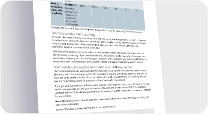 Situation Example Preferred UMP UMP Other UMP You pay provider allowed normal plan pays your charge amount benefit pays provider other plan The other is primary plan pays less than the normal UMP benefit UMP is EXAMPLE 3: $200 $100 $85 $85 $0 $15 secondary, The other other plan plan pays as is primary much as (or more than) the normal UMP benefit Contact UMP Customer Service for help with any questions if you are covered by more than one plan. Submit secondary claims promptly All health plans have a “timely submitting” deadline. The timely submitting deadline for UMP is 12 months from the date of service. If a claim is not submitted within the plan’s timely submitting deadline, UMP will deny it. If your primary plan delays payment on a claim, you must still submit to UMP within the submitting deadline to prevent denial of the claim. UMP may try to contact your primary plan for their benefit payment information or may estimate it to provide timely processing of your secondary benefit. Adjustments may be made when the primary plan pays their portion of your claim. Notifying your providers of any change to your coverage will help avoid errors and delays in processing of claims (see the “Billing and payment: submitting a claim” section). How diabetes care supplies are covered when UMP pays second UMP covers diabetes care supplies under the prescription drug benefit. If you get your supplies from a pharmacy, ask if the pharmacy can bill both your primary plan and UMP. If your pharmacy does, you do not need to do anything further. If not, you will need to send a claim to WSRxS for secondary payment (see the “Submitting a claim for prescription drugs” section for instructions). If you get your supplies from a diabetes care supplier, the primary plan may process the claim as medical. In this case, you need to send your Explanation of Benefits and a claim form to WSRxS for secondary payment (see the “Submitting a claim for prescription drugs” and the “False claims or statements” sections for instructions). Note: Nonduplication of benefits applies to these claims, which means that UMP may pay nothing after your primary plan pays. See the “Diabetes care supplies” benefit for more information. ALERT! You must submit secondary claims for diabetes care supplies to WSRxS. Regence BlueShield will deny these claims. 120 2024 UMP CDHP (PEBB) Certificate of Coverage