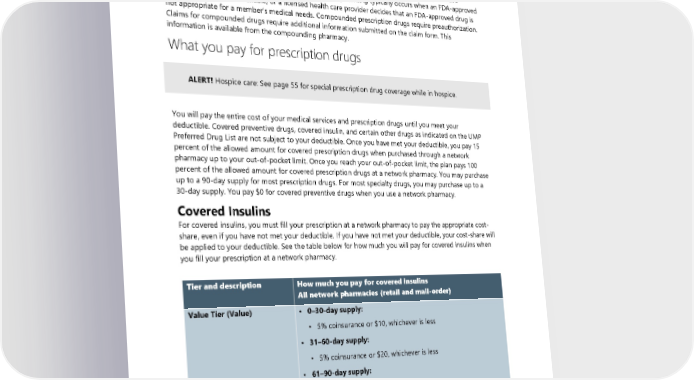 through your medical benefit. Vaccines administered at network pharmacies may be covered under your pharmacy benefit. Compounded prescription drugs Compounded prescription drugs are the result of combining, mixing, or altering ingredients by a pharmacist in response to a physician’s prescription to create a new drug tailored to the specialized medical needs of an individual member. Traditional compounding typically occurs when an FDA-approved prescription drug is unavailable, or a licensed health care provider decides that an FDA-approved drug is not appropriate for a member’s medical needs. Compounded prescription drugs require preauthorization. Claims for compounded drugs require additional information submitted on the claim form. This information is available from the compounding pharmacy. What you pay for prescription drugs ALERT! Hospice care: See page 55 for special prescription drug coverage while in hospice. You will pay the entire cost of your medical services and prescription drugs until you meet your deductible. Covered preventive drugs, covered insulin, and certain other drugs as indicated on the UMP Preferred Drug List are not subject to your deductible. Once you have met your deductible, you pay 15 percent of the allowed amount for covered prescription drugs when purchased through a network pharmacy up to your out-of-pocket limit. Once you reach your out-of-pocket limit, the plan pays 100 percent of the allowed amount for covered prescription drugs at a network pharmacy. You may purchase up to a 90-day supply for most prescription drugs. For most specialty drugs, you may purchase up to a 30-day supply. You pay $0 for covered preventive drugs when you use a network pharmacy. Covered Insulins For covered insulins, you must fill your prescription at a network pharmacy to pay the appropriate cost- share, even if you have not met your deductible. If you have not met your deductible, your cost-share will be applied to your deductible. See the table below for how much you will pay for covered insulins when you fill your prescription at a network pharmacy. Tier and description How much you pay for covered insulins All network pharmacies (retail and mail-order) Value Tier (Value) • 0–30-day supply: ▪ 5% coinsurance or $10, whichever is less • 31–60-day supply: ▪ 5% coinsurance or $20, whichever is less • 61–90-day supply: ▪ 5% coinsurance or $30, whichever is less Tier 1 (Tier 1) • 0–30-day supply: ▪ 10% coinsurance or $25, whichever is less • 31–60-day supply: ▪ 10% coinsurance or $50, whichever is less 92 2024 UMP CDHP (PEBB) Certificate of Coverage
