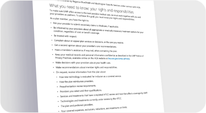 • When you have received a recovery from another source relating to an illness or injury for services for which we normally would provide benefits. The amount of any exclusions under this provision, however, will not exceed the amount of your recovery. • Until the total amount excluded equals the third-party recovery. General provisions UMP is administered by Regence BlueShield and Washington State Rx Services under contract with HCA. What you need to know: your rights and responsibilities To make sure UMP offers access to the best possible medical care, we must work together with you and your providers as partners. To achieve this goal, you must know your rights and responsibilities. As a plan member, you have the right to: • Ask your provider to submit secondary claims to Medicare, if applicable. • Be informed by your providers about all appropriate or medically necessary treatment options for your condition, regardless of cost or benefit coverage. • Be treated with respect. • Complain about or appeal plan services or decisions, or the care you receive. • Get a second opinion about your provider’s care recommendations. • Have a translator’s assistance, if required, when contacting the plan. • Keep your medical records and personal information confidential as described in the UMP Notice of Privacy Practices, available online on the HCA website at hca.wa.gov/ump-privacy. • Make decisions with your providers about your health care. • Make recommendations about member rights and responsibilities. • On request, receive information from the plan about: ▪ How new technology is evaluated for inclusion as a covered service. ▪ How the plan reimburses providers. ▪ Preauthorization review requirements. ▪ Providers you select and their qualifications. ▪ Services and treatments that have completed HTCC review and how that affects coverage by UMP. ▪ Technologies and treatments currently under review by the HTCC. ▪ The plan and preferred providers. ▪ Your covered expenses, exclusions, reductions, and maximums or limits. • Receive: ▪ A written explanation from the plan about any request to refund an overpayment. ▪ All covered services and supplies determined to be medically necessary as described in this COC, subject to the maximums, limits, exclusions, deductible, and coinsurance. ▪ Courteous, prompt answers from the plan. 2024 UMP CDHP (PEBB) Certificate of Coverage 133