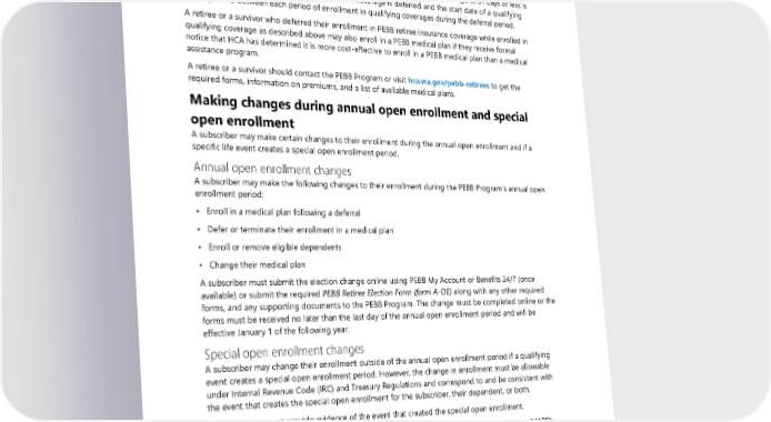 and their enrolled dependents will be enrolled in the Uniform Medical Plan Classic during the gap month(s) prior to when the MAPD plan begins. For a retiree or a survivor to enroll in a PEBB medical plan, the enrollment must be completed online using Benefits 24/7 (once available) or the PEBB Program must receive a PEBB Retiree Election Form (form A), any other required forms, supporting documents, and evidence of continuous enrollment in one or more qualifying coverages during the timelines described in this section. A gap in coverage of 31 days or less is allowed between the date PEBB retiree insurance coverage is deferred and the start date of a qualifying coverage, and between each period of enrollment in qualifying coverages during the deferral period. A retiree or a survivor who deferred their enrollment in PEBB retiree insurance coverage while enrolled in qualifying coverage as described above may also enroll in a PEBB medical plan if they receive formal notice that HCA has determined it is more cost-effective to enroll in a PEBB medical plan than a medical assistance program. A retiree or a survivor should contact the PEBB Program or visit hca.wa.gov/pebb-retirees to get the required forms, information on premiums, and a list of available medical plans. Making changes during annual open enrollment and special open enrollment A subscriber may make certain changes to their enrollment during the annual open enrollment and if a specific life event creates a special open enrollment period. Annual open enrollment changes A subscriber may make the following changes to their enrollment during the PEBB Program’s annual open enrollment period: • Enroll in a medical plan following a deferral • Defer or terminate their enrollment in a medical plan • Enroll or remove eligible dependents • Change their medical plan A subscriber must submit the election change online using PEBB My Account or Benefits 24/7 (once available) or submit the required PEBB Retiree Election Form (form A-OE) along with any other required forms, and any supporting documents to the PEBB Program. The change must be completed online or the forms must be received no later than the last day of the annual open enrollment period and will be effective January 1 of the following year. Special open enrollment changes A subscriber may change their enrollment outside of the annual open enrollment period if a qualifying event creates a special open enrollment period. However, the change in enrollment must be allowable under Internal Revenue Code (IRC) and Treasury Regulations and correspond to and be consistent with the event that creates the special open enrollment for the subscriber, their dependent, or both. The subscriber must provide evidence of the event that created the special open enrollment. To disenroll from a Medicare Advantage (MA) plan or Medicare Advantage Prescription Drug (MAPD) plan, the change in enrollment must be allowable under federal regulations. To make an enrollment change, the subscriber must submit the change online using Benefits 24/7 (once available) or submit the required PEBB Retiree Change Form (form E) along with any other required forms to the PEBB Program. The change must be completed online or the PEBB Program must receive the forms no later than 60 days after the event that creates the special open enrollment. In addition, the PEBB 2024 UMP CDHP (PEBB) Certificate of Coverage 163