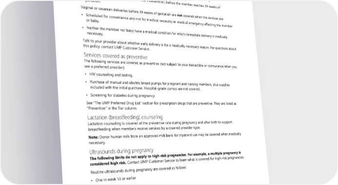 Deliveries before 39 weeks gestation Vaginal or cesarean deliveries before 39 weeks of gestation are covered when the services are medically necessary. Examples include: • A medical emergency affecting the member or baby. • A medical condition of the member or baby for which a delivery is medically necessary. • Labor begins naturally (without medical intervention) before the member reaches 39 weeks of gestation. Vaginal or cesarean deliveries before 39 weeks of gestation are not covered when the services are: • Scheduled for convenience and not for medical necessity or medical emergency affecting the member or baby. • Neither the member nor baby have a medical condition for which immediate delivery is medically necessary. Talk to your provider about whether early delivery is for a medically necessary reason. For questions about this policy, contact UMP Customer Service. Services covered as preventive The following services are covered as preventive (not subject to your deductible or coinsurance when you see a preferred provider): • HIV counseling and testing. • Purchase of manual and electric breast pumps for pregnant and nursing members, plus supplies included with the initial purchase. Hospital-grade pumps are not covered. • Screening for diabetes during pregnancy. See “The UMP Preferred Drug List” section for prescription drugs that are preventive. They are listed as “Preventive” in the Tier column. Lactation (breastfeeding) counseling Lactation counseling is covered at the preventive rate during pregnancy and after birth to support breastfeeding when members receive services by a covered provider type. Note: Donor human milk from an approved milk bank for inpatient use may be covered when medically necessary. Ultrasounds during pregnancy The following limits do not apply to high-risk pregnancies. For example, a multiple pregnancy is considered high risk. Contact UMP Customer Service to learn what is covered for high-risk pregnancies. Routine ultrasounds during pregnancy are covered as follows: • One in week 13 or earlier • One during weeks 13-28 Adding a new dependent to your coverage For information about how to enroll new dependents in your health plan, refer to the Employee Enrollment Guide or the Retiree Enrollment Guide on the HCA website at hca.wa.gov/employee-retiree- benefits/forms-and-publications. You can also refer to “Making changes” in the “Eligibility and Enrollment” and in the “Eligibility and enrollment for a retiree or survivor” sections of this certificate of coverage for more information. 64 2024 UMP CDHP (PEBB) Certificate of Coverage