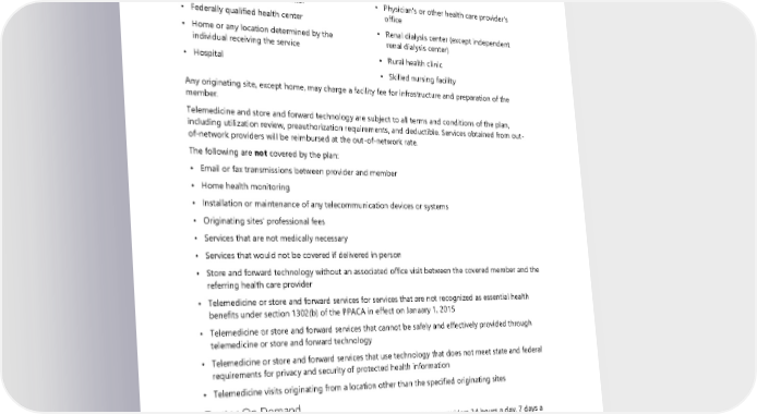 If services are provided through store and forward technology, there must be an associated office visit between the covered person and the referring health care provider. The associated office visit may be in person or via telemedicine. For audio-only telemedicine, the member must have an established relationship with the provider. The originating site (the member’s physical location) for telemedicine services must be one of the following sites: • Community mental health center • Physician's or other health care provider's • Federally qualified health center office • Home or any location determined by the • Renal dialysis center (except independent individual receiving the service renal dialysis center) • Hospital • Rural health clinic • Skilled nursing facility Any originating site, except home, may charge a facility fee for infrastructure and preparation of the member. Telemedicine and store and forward technology are subject to all terms and conditions of the plan, including utilization review, preauthorization requirements, and deductible. Services obtained from out- of-network providers will be reimbursed at the out-of-network rate. The following are not covered by the plan: • Email or fax transmissions between provider and member • Home health monitoring • Installation or maintenance of any telecommunication devices or systems • Originating sites’ professional fees • Services that are not medically necessary • Services that would not be covered if delivered in person • Store and forward technology without an associated office visit between the covered member and the referring health care provider • Telemedicine or store and forward services for services that are not recognized as essential health benefits under section 1302(b) of the PPACA in effect on January 1, 2015 • Telemedicine or store and forward services that cannot be safely and effectively provided through telemedicine or store and forward technology • Telemedicine or store and forward services that use technology that does not meet state and federal requirements for privacy and security of protected health information • Telemedicine visits originating from a location other than the specified originating sites Doctor On Demand Doctor On Demand is a virtual care service that gives you access to providers 24 hours a day, 7 days a week. It is a good option to consider when you need medical attention, but not emergency room or urgent care. Doctor On Demand providers are board-certified, U.S.-based providers who are specifically trained in video medicine. Members can connect in minutes with doctors face-to-face through a smartphone, tablet, or computer via the website or Doctor On Demand smartphone application. To learn more, visit the Telemedicine (virtual care) webpage at ump.regence.com/pebb/benefits/telemedicine. 78 2024 UMP CDHP (PEBB) Certificate of Coverage