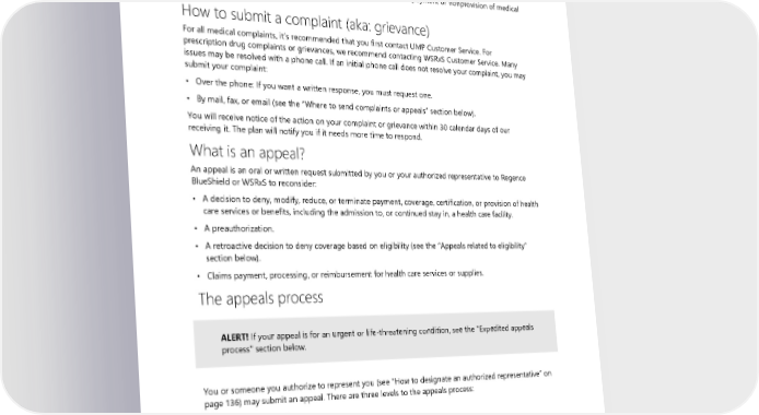 • Dissatisfaction with medical care. • Dissatisfaction with service provided by the health plan. • Provider or staff attitude or demeanor. • Waiting time for medical services. Note: If your issue is regarding a denial, reduction, or termination of payment or nonprovision of medical services, it is an appeal. How to submit a complaint (aka: grievance) For all medical complaints, it’s recommended that you first contact UMP Customer Service. For prescription drug complaints or grievances, we recommend contacting WSRxS Customer Service. Many issues may be resolved with a phone call. If an initial phone call does not resolve your complaint, you may submit your complaint: • Over the phone: If you want a written response, you must request one. • By mail, fax, or email (see the “Where to send complaints or appeals” section below). You will receive notice of the action on your complaint or grievance within 30 calendar days of our receiving it. The plan will notify you if it needs more time to respond. What is an appeal? An appeal is an oral or written request submitted by you or your authorized representative to Regence BlueShield or WSRxS to reconsider: • A decision to deny, modify, reduce, or terminate payment, coverage, certification, or provision of health care services or benefits, including the admission to, or continued stay in, a health care facility. • A preauthorization. • A retroactive decision to deny coverage based on eligibility (see the “Appeals related to eligibility” section below). • Claims payment, processing, or reimbursement for health care services or supplies. The appeals process ALERT! If your appeal is for an urgent or life-threatening condition, see the "Expedited appeals process" section below. You or someone you authorize to represent you (see “How to designate an authorized representative” on page 136) may submit an appeal. There are three levels to the appeals process: 1. First-level appeal 2. Second-level appeal 3. External review (independent review) Each of those parts are described in further detail below. 2024 UMP CDHP (PEBB) Certificate of Coverage 125