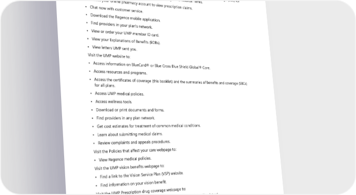 Online services See the Directory pages at the beginning of this booklet for links and contact information. Visit the UMP website to register for a Regence account and get personalized information such as: • Access the certificate of coverage (this booklet) and the summary of benefits and coverage (SBC) for your plan, as well as the Glossary of Health Coverage and Medical Terms. • Access your online pharmacy account to view prescription claims. • Chat now with customer service. • Download the Regence mobile application. • Find providers in your plan’s network. • View or order your UMP member ID card. • View your Explanations of Benefits (EOBs). • View letters UMP sent you. Visit the UMP website to: • Access information on BlueCard® or Blue Cross Blue Shield Global® Core. • Access resources and programs. • Access the certificates of coverage (this booklet) and the summaries of benefits and coverage (SBCs) for all plans. • Access UMP medical policies. • Access wellness tools. • Download or print documents and forms. • Find providers in any plan network. • Get cost estimates for treatment of common medical conditions. • Learn about submitting medical claims. • Review complaints and appeals procedures. Visit the Policies that affect your care webpage to: • View Regence medical policies. Visit the UMP vision benefits webpage to: • Find a link to the Vision Service Plan (VSP) website. • Find information on your vision benefit. Visit the UMP Prescription drug coverage webpage to: • Find a link to the UMP Preferred Drug List and the Drug Price Check tool. • Find a link to your online pharmacy account. • Find information on mail-order and specialty drugs. • Learn about submitting prescription drug claims. • Locate network pharmacies or network vaccination pharmacies. 2024 UMP CDHP (PEBB) Certificate of Coverage 13