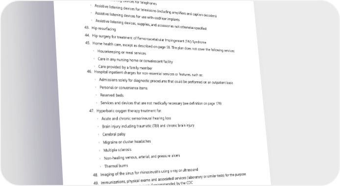 The types of ancillary equipment not covered are: ◦ Alerting devices ◦ Assistive listening devices for FM/DM systems, receivers and transmitters ◦ Assistive listening devices for microphone transmitters ◦ Assistive listening devices for TDD machines ◦ Assistive listening devices for telephones ◦ Assistive listening devices for televisions (including amplifiers and caption decoders) ◦ Assistive listening devices for use with cochlear implants ◦ Assistive listening devices, supplies, and accessories not otherwise specified 43. Hip resurfacing 44. Hip surgery for treatment of Femoroacetabular Impingement (FAI) Syndrome 45. Home health care, except as described on page 58. The plan does not cover the following services: ◦ Housekeeping or meal services ◦ Care in any nursing home or convalescent facility ◦ Care provided by a family member 46. Hospital inpatient charges for non-essential services or features, such as: ◦ Admissions solely for diagnostic procedures that could be performed on an outpatient basis ◦ Personal or convenience items ◦ Reserved beds ◦ Services and devices that are not medically necessary (see definition on page 179) 47. Hyperbaric oxygen therapy treatment for: ◦ Acute and chronic sensorineural hearing loss ◦ Brain injury including traumatic (TBI) and chronic brain injury ◦ Cerebral palsy ◦ Migraine or cluster headaches ◦ Multiple sclerosis ◦ Non-healing venous, arterial, and pressure ulcers ◦ Thermal burns 48. Imaging of the sinus for rhinosinusitis using x-ray or ultrasound 49. Immunizations, physical exams and associated services (laboratory or similar tests) for the purpose of travel or employment, even if recommended by the CDC 50. Implantable drug delivery systems (IDDS or infusion pumps) for chronic, non-cancer pain 51. Incarceration: Services and supplies provided while confined in a prison or jail 52. Infertility or fertility testing or treatment after initial diagnosis, including drugs, pharmaceuticals, artificial insemination, and any other type of testing, treatment, complications resulting from such treatment (e.g., selective fetal reduction), or visits for infertility 110 2024 UMP Plus–PSHVN (PEBB) Certificate of Coverage