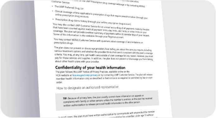 • The Summary of Benefits and Coverage (SBC) • When the plan may retroactively deny coverage for preauthorized medical services The following are available through your Regence account or by contacting UMP Customer Service: • Medical claims history and medical deductible status • Online directory of network providers, including both primary care providers and specialists The following are available on the UMP Prescription drug coverage webpage or by contacting WSRxS Customer Service: • The UMP Preferred Drug List • Clinical coverage criteria applicable to prescription drugs that require preauthorization (through your online prescription drug account) • Prescription drug claims history (through your online prescription drug account) You may also contact UMP Customer Service for an annual accounting of all payments made by the plan that have been counted against medical payment limits, day limits, visit limits, or other limits on your coverage. The plan will provide a written summary of payments within 30 calendar days of your request. Some of this information is also available through your Regence account. You may contact WSRxS Customer Service with questions about coverage of and limitations on prescription drugs. The plan does not prevent or discourage providers from telling you about the care you require, including various treatment options and whether the provider thinks that care is consistent with the plan’s coverage criteria. You may, at any time, get health care outside of plan coverage for any reason. However, you must pay for those services and supplies. In addition, the plan does not prevent or discourage you from talking about other health plans with your provider. Confidentiality of your health information The plan follows the UMP Notice of Privacy Practices, available online on the HCA website at hca.wa.gov/ump-privacy or by contacting UMP Customer Service. The plan will release member health information only as described in that notice or as required or permitted by law or court order. How to designate an authorized representative TIP: Because of privacy laws, the plan usually cannot share information on appeals or complaints with family or other persons unless the member is a minor, or the plan has received written authorization to release personal health information to the other person. In most cases, the plan must have written authorization to communicate with anyone but the member. However, a parent or legal guardian may act as a representative for a member under age 13 without written authorization, except for issues involving contraceptive use. For members ages 13 to 17, a parent or legal guardian may usually act as a representative, except for certain specially protected types of information, for which the plan must receive written authorization as described below. You may choose to authorize a representative to: • Communicate with the plan on your behalf regarding an appeal in process. • Share your protected health information. 136 2024 UMP Plus–PSHVN (PEBB) Certificate of Coverage