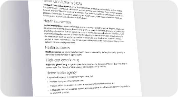 Habilitative (neurodevelopmental) services Habilitative (neurodevelopmental) services are health care services that help you keep, learn, or improve skills and functioning for daily living. Examples include therapy for a child who isn't walking or talking at the expected age. These services may include physical and occupational therapy, speech- language pathology, and other services for people with disabilities in a variety of inpatient and/or outpatient settings. Health Care Authority (HCA) The Health Care Authority (HCA) is the Washington State agency that administers the Uniform Medical Plan (UMP Classic, UMP Select, UMP CDHP, and the UMP Plus plans: UMP Plus–Puget Sound High Value Network and UMP Plus–UW Medicine Accountable Care Network), in addition to the following health care programs: Washington Prescription Drug Program, PEBB Program, SEBB Program, Behavioral Health and Recovery, and Apple Health (also known as Medicaid). Health intervention Health intervention is a prescription drug, service, or supply provided to prevent, diagnose, detect, treat, or palliate the following: disease, illness, injury, genetic or congenital anomaly, pregnancy, or biological or psychological condition that lies outside the range of normal, age-appropriate human variation. A health intervention may also maintain or restore functional ability. A health intervention is defined not only by the intervention itself, but also by the medical condition and patient indications for which it is being applied. A health intervention is new if it is not yet in widespread use for the medical condition and the patient indications being considered. Health outcomes Health outcomes are results that affect health status as measured by the length or quality (primarily as perceived by the member) of a person’s life. High-cost generic drug High-cost generic drug is a generic prescription drug (see the definition of “Generic drug”) that the plan covers under Tier 2 (see the “What you pay for prescription drugs” section). Home health agency A home health agency is an agency or organization that: • Provides a program of home health care; • Practices within the scope of its license as a provider of home health services; and • Is Medicare-certified, accredited by the Joint Commission on Accreditation of Healthcare Organizations, or a network provider. Hospice Hospice is services provided by a state-licensed hospice program in the member’s home or in a hospice facility to terminally ill members. Hospice care includes services such as pain care relief for terminally ill members without the intent to cure, and support services for their families. 176 2024 UMP Plus–PSHVN (PEBB) Certificate of Coverage