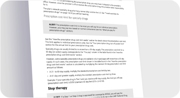 Specialty drugs require preauthorization. See “Preauthorizing prescription drugs” on page 98 for how to request preauthorization. A patient care coordinator will work with you to schedule a delivery time for the prescription drug. The specialty drug pharmacy will deliver your prescription drugs anywhere in the U.S. that you choose, such as to your workplace or to a neighbor if you cannot be home for the delivery. Specialty prescription drugs often require special handling and storage. The plan is not responsible for replacement of lost, stolen, expired, or damaged prescription drugs or products (see the “What the plan does not cover” section). If your provider will be administering the prescription drug, you may have it shipped to the provider’s office. However, once the provider’s office receives the prescription drug, the provider takes responsibility for it. The plan’s network specialty drug pharmacy cannot ship outside the U.S. See “Travel overrides for prescription drugs” on page 102 if you will be traveling. Prescription cost-limit for specialty drugs ALERT! The prescription cost-limit is the most you will pay for an individual prescription. However, you may pay less based on normal coinsurance (see the "What you pay for prescription drugs" section). See the “How the prescription drug cost-limit works” section for details about the prescription cost-limit. This limit applies to individual prescriptions only. See the “Your prescription drug out-of-pocket limit” section for the annual limit to your prescription drug costs. Specialty drugs are usually limited to no more than a 30-day supply. The prescription cost-limit for a 30-day (or under) supply corresponds to the “You pay” column in the table found in the "How the prescription drug cost-limit works" section. However, some specialty prescription drugs are available only in packages with more than a 30-day supply. In such cases, the prescription cost-limit shown in the table found in the "How the prescription drug cost-limit works" section is calculated by multiplying the standard 30-day prescription cost-limit amount as follows: • A 31- to 60-day supply, multiply the standard prescription cost-limit by two. • A 61-day and greater supply, multiply the standard prescription cost-limit by three. Example: If your specialty drug is Tier 2 and you receive a 45-day supply, the most you will pay (prescription cost-limit) is $150 (standard 30-day limit $75 x 2=$150). Step therapy ALERT! If a Step 1 or Step 2 drug is approved for coverage by WSRxS, you will pay the applicable cost-share of that prescription drug according to its tier in the UMP Preferred Drug List. When a prescription drug is part of the step therapy program, you have to try certain drugs (Step 1) before the plan will cover the prescribed (Step 2) drug. When a prescription for a step therapy drug is submitted “out of order,” meaning you have not first tried the Step 1 drug before submitting a 100 2024 UMP Plus–PSHVN (PEBB) Certificate of Coverage