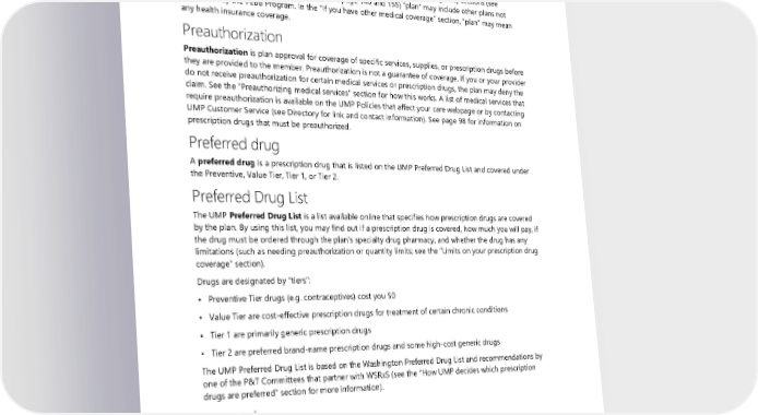 Find the complete list of covered provider types on the UMP website at ump.regence.com/pebb/benefits/providers/covered-providers. Plan Plan, as referred to in this document, means Uniform Medical Plan Plus–Puget Sound High Value Network (UMP Plus–PSHVN), a self-insured ACP offered by the PEBB Program. In the eligibility sections (see “Eligibility for subscribers and dependents” on page 140 and 155) “plan” may include other plans not sponsored by the PEBB Program. In the “If you have other medical coverage” section, “plan” may mean any health insurance coverage. Preauthorization Preauthorization is plan approval for coverage of specific services, supplies, or prescription drugs before they are provided to the member. Preauthorization is not a guarantee of coverage. If you or your provider do not receive preauthorization for certain medical services or prescription drugs, the plan may deny the claim. See the “Preauthorizing medical services” section for how this works. A list of medical services that require preauthorization is available on the UMP Policies that affect your care webpage or by contacting UMP Customer Service (see Directory for link and contact information). See page 98 for information on prescription drugs that must be preauthorized. Preferred drug A preferred drug is a prescription drug that is listed on the UMP Preferred Drug List and covered under the Preventive, Value Tier, Tier 1, or Tier 2. Preferred Drug List The UMP Preferred Drug List is a list available online that specifies how prescription drugs are covered by the plan. By using this list, you may find out if a prescription drug is covered, how much you will pay, if the drug must be ordered through the plan’s specialty drug pharmacy, and whether the drug has any limitations (such as needing preauthorization or quantity limits; see the ”Limits on your prescription drug coverage” section). Drugs are designated by “tiers”: • Preventive Tier drugs (e.g. contraceptives) cost you $0 • Value Tier are cost-effective prescription drugs for treatment of certain chronic conditions • Tier 1 are primarily generic prescription drugs • Tier 2 are preferred brand-name prescription drugs and some high-cost generic drugs The UMP Preferred Drug List is based on the Washington Preferred Drug List and recommendations by one of the P&T Committees that partner with WSRxS (see the “How UMP decides which prescription drugs are preferred” section for more information). Prenatal Prenatal means during pregnancy. Prescription cost-limit The prescription cost-limit is the most you pay for a Value Tier drug, Tier 1 drug, and Tier 2 drug at a network pharmacy. See the “How the prescription drug cost-limit works” section for more information. 2024 UMP Plus–PSHVN (PEBB) Certificate of Coverage 185