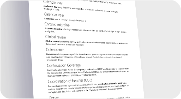 Brand-name drug A brand-name drug is a prescription drug sold under the proprietary name or trade name selected by the manufacturer. Business day Business days are Mondays through Fridays, except for legal holidays observed by Washington State. Calendar day A calendar day is any day of the week regardless of whether it is observed as a legal holiday by Washington State. Calendar year A calendar year is January 1 through December 31. Chronic migraine A chronic migraine is having a headache on 15 or more days per month of which eight or more days are a migraine. Clinical review Clinical review is when the plan has a clinical professional review medical records related to treatment to determine if treatment is medically necessary. Coinsurance Coinsurance is the percentage of the allowed amount you must pay the provider on claims for which the plan pays less than 100 percent of the allowed amount. This includes most medical services and prescription drugs. Continuation Coverage Continuation Coverage means the temporary continuation of PEBB benefits available to enrollees under the Consolidated Omnibus Budget Reconciliation Act (COBRA), the Uniformed Services Employment and Reemployment Rights Act (USERRA), or PEB Board policies. Coordination of benefits (COB) For members covered by more than one group health plan, coordination of benefits (COB) is the method the plan uses to determine which plan pays first, which pays second, and the amount paid by each plan. See description and examples in the “If you have other medical coverage” section. Copay Copay is a set dollar amount you pay when receiving specific services, treatments, or supplies, such as chiropractic, acupuncture, massage therapy, inpatient hospitalization, or emergency room visits. Core network providers Core network providers are primary care providers (PCP), specialty providers, and facilities (such as hospitals, surgery centers, and clinics) contracted directly with UMP Plus–PSHVN. 2024 UMP Plus–PSHVN (PEBB) Certificate of Coverage 171