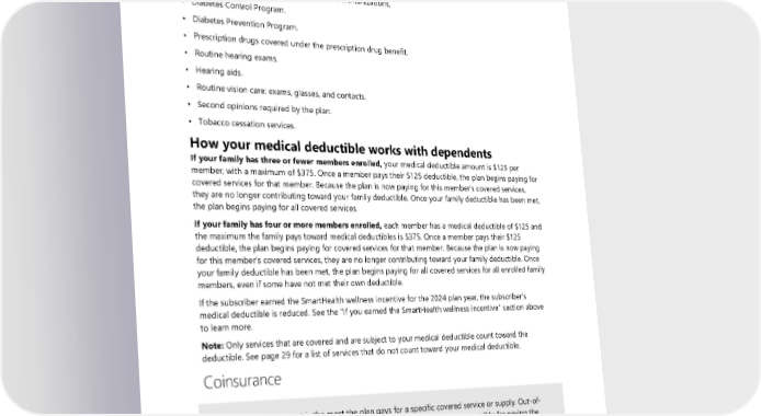 Services not subject to your medical deductible The plan pays the allowed amount for the services listed below, subject to cost-share, even if you have not met your medical deductible. When you see a network provider, you do not have to meet your medical deductible before the plan pays for these services: • Covered contraceptive supplies and services (see the “Family planning services” benefit). • Covered preventive care, including covered immunizations. • Diabetes Control Program. • Diabetes Prevention Program. • Prescription drugs covered under the prescription drug benefit. • Routine hearing exams. • Hearing aids. • Routine vision care: exams, glasses, and contacts. • Second opinions required by the plan. • Tobacco cessation services. How your medical deductible works with dependents If your family has three or fewer members enrolled, your medical deductible amount is $125 per member, with a maximum of $375. Once a member pays their $125 deductible, the plan begins paying for covered services for that member. Because the plan is now paying for this member’s covered services, they are no longer contributing toward your family deductible. Once your family deductible has been met, the plan begins paying for all covered services. If your family has four or more members enrolled, each member has a medical deductible of $125 and the maximum the family pays toward medical deductibles is $375. Once a member pays their $125 deductible, the plan begins paying for covered services for that member. Because the plan is now paying for this member’s covered services, they are no longer contributing toward your family deductible. Once your family deductible has been met, the plan begins paying for all covered services for all enrolled family members, even if some have not met their own deductible. If the subscriber earned the SmartHealth wellness incentive for the 2024 plan year, the subscriber’s medical deductible is reduced. See the “If you earned the SmartHealth wellness incentive” section above to learn more. Note: Only services that are covered and are subject to your medical deductible count toward the deductible. See page 29 for a list of services that do not count toward your medical deductible. Coinsurance TIP: Allowed amount is the most the plan pays for a specific covered service or supply. Out-of- network providers may charge more than this amount, and you are responsible for paying the difference between the billed amount and the allowed amount. This is called balance billing. Coinsurance is the percentage of the allowed amount you pay for most medical services and for prescription drugs when the plan pays less than 100 percent. After you meet your medical deductible, you pay the percentages described below for most covered medical services. See the following sections for 30 2024 UMP Plus–PSHVN (PEBB) Certificate of Coverage