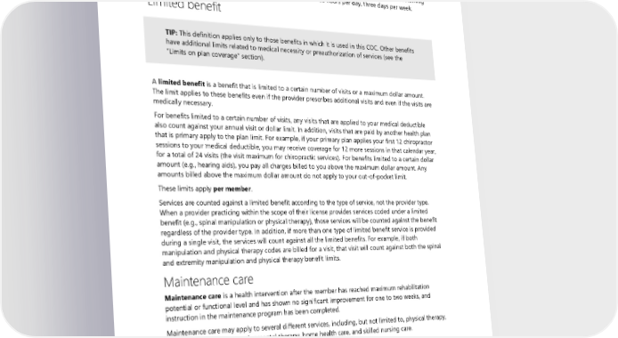 Intensive Outpatient Program Intensive Outpatient Program (IOP) is an outpatient program that is licensed as a facility or agency by the appropriate state agency and is provided under the supervision of a psychiatrist or psychiatric extender. IOP is intended to provide treatment on an outpatient basis, does not include boarding or housing, and is intended to provide treatment interventions in a structured setting, with patients returning to their home environments each day. IOP is a minimum of three hours per day, three days per week. Limited benefit TIP: This definition applies only to those benefits in which it is used in this COC. Other benefits have additional limits related to medical necessity or preauthorization of services (see the “Limits on plan coverage” section). A limited benefit is a benefit that is limited to a certain number of visits or a maximum dollar amount. The limit applies to these benefits even if the provider prescribes additional visits and even if the visits are medically necessary. For benefits limited to a certain number of visits, any visits that are applied to your medical deductible also count against your annual visit or dollar limit. In addition, visits that are paid by another health plan that is primary apply to the plan limit. For example, if your primary plan applies your first 12 chiropractor sessions to your medical deductible, you may receive coverage for 12 more sessions in that calendar year, for a total of 24 visits (the visit maximum for chiropractic services). For benefits limited to a certain dollar amount (e.g., hearing aids), you pay all charges billed to you above the maximum dollar amount. Any amounts billed above the maximum dollar amount do not apply to your out-of-pocket limit. These limits apply per member. Services are counted against a limited benefit according to the type of service, not the provider type. When a provider practicing within the scope of their license provides services coded under a limited benefit (e.g., spinal manipulation or physical therapy), those services will be counted against the benefit regardless of the provider type. In addition, if more than one type of limited benefit service is provided during a single visit, the services will count against all the limited benefits. For example, if both manipulation and physical therapy codes are billed for a visit, that visit will count against both the spinal and extremity manipulation and physical therapy benefit limits. Maintenance care Maintenance care is a health intervention after the member has reached maximum rehabilitation potential or functional level and has shown no significant improvement for one to two weeks, and instruction in the maintenance program has been completed. Maintenance care may apply to several different services, including, but not limited to, physical therapy, speech therapy, neurodevelopmental therapy, home health care, and skilled nursing care. Medical Medical generally refers to all plan benefits and services other than those covered under preventive care and prescription drug benefits (except as the term is used in the eligibility sections of this COC). 178 2024 UMP Plus–PSHVN (PEBB) Certificate of Coverage