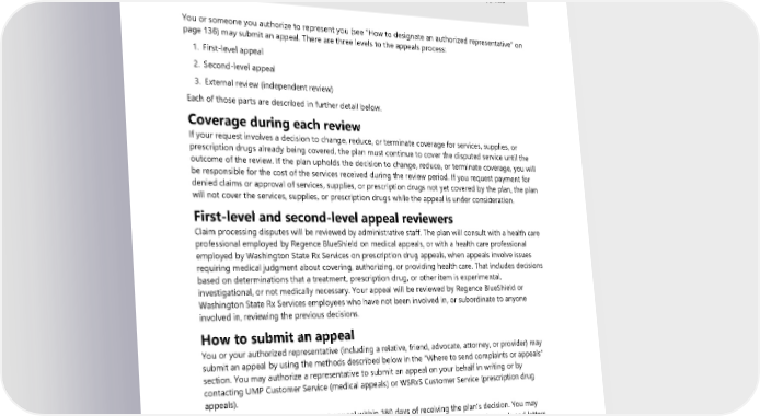 • Claims payment, processing, or reimbursement for health care services or supplies. The appeals process ALERT! If your appeal is for an urgent or life-threatening condition, see the "Expedited appeals process" section below. You or someone you authorize to represent you (see “How to designate an authorized representative” on page 136) may submit an appeal. There are three levels to the appeals process: 1. First-level appeal 2. Second-level appeal 3. External review (independent review) Each of those parts are described in further detail below. Coverage during each review If your request involves a decision to change, reduce, or terminate coverage for services, supplies, or prescription drugs already being covered, the plan must continue to cover the disputed service until the outcome of the review. If the plan upholds the decision to change, reduce, or terminate coverage, you will be responsible for the cost of the services received during the review period. If you request payment for denied claims or approval of services, supplies, or prescription drugs not yet covered by the plan, the plan will not cover the services, supplies, or prescription drugs while the appeal is under consideration. First-level and second-level appeal reviewers Claim processing disputes will be reviewed by administrative staff. The plan will consult with a health care professional employed by Regence BlueShield on medical appeals, or with a health care professional employed by Washington State Rx Services on prescription drug appeals, when appeals involve issues requiring medical judgment about covering, authorizing, or providing health care. That includes decisions based on determinations that a treatment, prescription drug, or other item is experimental, investigational, or not medically necessary. Your appeal will be reviewed by Regence BlueShield or Washington State Rx Services employees who have not been involved in, or subordinate to anyone involved in, reviewing the previous decisions. How to submit an appeal You or your authorized representative (including a relative, friend, advocate, attorney, or provider) may submit an appeal by using the methods described below in the “Where to send complaints or appeals” section. You may authorize a representative to submit an appeal on your behalf in writing or by contacting UMP Customer Service (medical appeals) or WSRxS Customer Service (prescription drug appeals). For each appeal request, you must appeal within 180 days of receiving the plan’s decision. You may include written comments, documents, and any other information, such as medical records and letters from your provider, to support your appeal request. The plan will consider all information submitted when reviewing your appeal. You may also request copies of documents the plan has that are relevant to your appeal, which the plan will provide at no cost to you. The plan will mail you a written response within 14 days of receiving your appeal request. If more time is needed to thoroughly research and review your appeal, the plan is allowed up to 30 days to respond. The 126 2024 UMP Plus–PSHVN (PEBB) Certificate of Coverage
