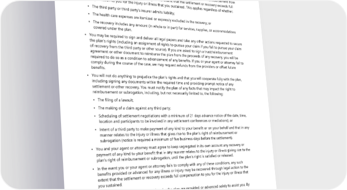 obligated, to recover any expenses, to the extent that they were paid under the plan, directly from any party liable to you, upon mailing of a written notice to the potential payer, to you, or to your representative. • The plan’s rights apply without regard to the source of payment for medical expenses, whether from the proceeds of any settlement, arbitration award, or judgment, or other characterization of the recovery by you or any third party or the recovery source. The plan is entitled to reimbursement from the first dollar received from any recovery to the extent that the settlement or recovery exceeds full compensation to you for the injury or illness that you sustained. This applies regardless of whether: ▪ The third party or third party’s insurer admits liability; ▪ The health care expenses are itemized or expressly excluded in the recovery; or ▪ The recovery includes any amount (in whole or in part) for services, supplies, or accommodations covered under the plan. • You may be required to sign and deliver all legal papers and take any other actions requested to secure the plan’s rights (including an assignment of rights to pursue your claim if you fail to pursue your claim of recovery from the third party or other source). If you are asked to sign a trust/reimbursement agreement or other document to reimburse the plan from the proceeds of any recovery, you will be required to do so as a condition to advancement of any benefits. If you or your agent or attorney fail to comply during the course of the case, we may request refunds from the providers or offset future benefits. • You will not do anything to prejudice the plan’s rights and that you will cooperate fully with the plan, including signing any documents within the required time and providing prompt notice of any settlement or other recovery. You must notify the plan of any facts that may impact the right to reimbursement or subrogation, including, but not necessarily limited to, the following: ▪ The filing of a lawsuit; ▪ The making of a claim against any third party; ▪ Scheduling of settlement negotiations with a minimum of 21 days advance notice of the date, time, location and participants to be involved in any settlement conferences or mediations); or ▪ Intent of a third party to make payment of any kind to your benefit or on your behalf and that in any manner relates to the injury or illness that gives rise to the plan’s right of reimbursement or subrogation (notice is required a minimum of five business days before the settlement). • You and your agent or attorney must agree to keep segregated in its own account any recovery or payment of any kind to your benefit that in any manner relates to the injury or illness giving rise to the plan’s right of reimbursement or subrogation, until the plan’s right is satisfied or released. • In the event you or your agent or attorney fails to comply with any of these conditions, any such benefits provided or advanced for any illness or injury may be recovered through legal action to the extent that the settlement or recovery exceeds full compensation to you for the injury or illness that you sustained. • Any benefits provided or advanced under the plan are provided or advanced solely to assist you. By paying such benefits, the plan is not waiving any right to reimbursement or subrogation. Fees and expenses You may incur attorney’s fees and costs in connection with obtaining a recovery. We may pay a proportional share of such attorney’s fees and costs you incur at the time of any settlement or recovery to otherwise reduce the amount of reimbursement paid to the plan to less than the full amount of benefits paid by the plan. 132 2024 UMP Plus–PSHVN (PEBB) Certificate of Coverage
