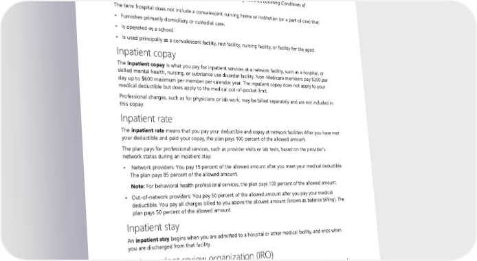 Hospital A hospital is an institution accredited under the Hospital Accreditation Program of the Joint Commission and licensed by the state where it is located. A hospital has a defined course of therapeutic intervention and special programming in a controlled environment. A hospital also offers a degree of security, supervision, and structure. Hospital patients must be medically monitored with 24-hour medical availability and 24-hour onsite services as defined in federal guidelines outlining Conditions of Participation for Hospitals. The term hospital does not include a convalescent nursing home or institution (or a part of one) that: • Furnishes primarily domiciliary or custodial care. • Is operated as a school. • Is used principally as a convalescent facility, rest facility, nursing facility, or facility for the aged. Inpatient copay The inpatient copay is what you pay for inpatient services at a network facility, such as a hospital, or skilled mental health, nursing, or substance use disorder facility. Non-Medicare members pay $200 per day up to $600 maximum per member per calendar year. The inpatient copay does not apply to your medical deductible but does apply to the medical out-of-pocket limit. Professional charges, such as for physicians or lab work, may be billed separately and are not included in this copay. Inpatient rate The inpatient rate means that you pay your deductible and copay at network facilities After you have met your deductible and paid your copay, the plan pays 100 percent of the allowed amount. The plan pays for professional services, such as provider visits or lab tests, based on the provider’s network status during an inpatient stay: • Network providers: You pay 15 percent of the allowed amount after you meet your medical deductible. The plan pays 85 percent of the allowed amount. Note: For behavioral health professional services, the plan pays 100 percent of the allowed amount. • Out-of-network providers: You pay 50 percent of the allowed amount after you pay your medical deductible. You pay all charges billed to you above the allowed amount (known as balance billing). The plan pays 50 percent of the allowed amount. Inpatient stay An inpatient stay begins when you are admitted to a hospital or other medical facility, and ends when you are discharged from that facility. Independent review organization (IRO) An independent review organization (IRO) conducts the independent (or external) review of an appeal. An IRO is a group of medical and benefit experts certified by the Washington State Department of Health and not related to the plan, Regence BlueShield, WSRxS, or HCA. An IRO is intended to provide unbiased, independent clinical and benefit expertise, as well as evidence-based decision making while ensuring confidentiality. The IRO reviews your appeal to determine if the plan’s decision is consistent with state law and the applicable COC. The plan pays the IRO’s charges. See “External review (independent review)” on page 129. 2024 UMP Plus–PSHVN (PEBB) Certificate of Coverage 177