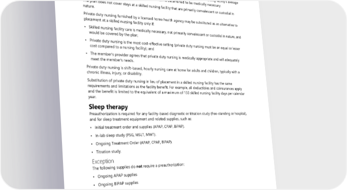 Skilled nursing facility services are paid at the inpatient rate. The plan must preauthorize services before you are admitted to a skilled nursing facility (see the “Limits on plan coverage” section). In addition, the facility must notify the plan within 24 hours of your admission (see page 105). This benefit covers skilled nursing facility charges for services, supplies, and room and board, including charges for services such as general nursing care made in connection with room occupancy. The plan covers up to 150 days per calendar year. Room and board is limited to the skilled nursing facility’s average semiprivate room rate, except where a private room is determined to be medically necessary. The plan does not cover stays at a skilled nursing facility that are primarily convalescent or custodial in nature. Private duty nursing furnished by a licensed home health agency may be substituted as an alternative to placement at a skilled nursing facility only if: • Skilled nursing facility care is medically necessary, not primarily convalescent or custodial in nature, and would be covered by the plan; • Private duty nursing is the most cost-effective setting (private duty nursing must be an equal or lesser cost compared to a nursing facility); and • The member's provider agrees that private duty nursing is medically appropriate and will adequately meet the member's needs. Private duty nursing is shift-based, hourly nursing care at home for adults and children, typically with a chronic illness, injury, or disability. Substitution of private duty nursing in lieu of placement in a skilled nursing facility has the same requirements and limitations as the facility benefit. For example, all deductibles and coinsurances apply and the benefit is limited to the equivalent of a maximum of 150 skilled nursing facility days per calendar year. Sleep therapy Preauthorization is required for any facility-based diagnostic or titration study (free-standing or hospital), and for sleep treatment equipment and related supplies, such as: • Initial treatment order and supplies (APAP, CPAP, BiPAP). • In-lab sleep study (PSG, MSLT, MWT). • Ongoing Treatment Order (APAP, CPAP, BiPAP). • Titration study. Exception The following supplies do not require a preauthorization: • Ongoing APAP supplies • Ongoing BiPAP supplies • Ongoing CPAP supplies Locations where sleep therapy services are not covered Sleep therapy services are not covered: • In the emergency room • At urgent-care facilities • During inpatient hospitalization 70 2024 UMP Plus–PSHVN (PEBB) Certificate of Coverage