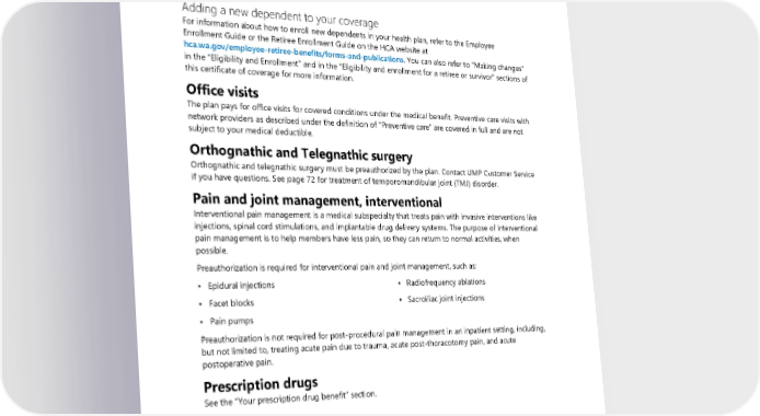 Ultrasounds during pregnancy The following limits do not apply to high-risk pregnancies. For example, a multiple pregnancy is considered high risk. Contact UMP Customer Service to learn what is covered for high-risk pregnancies. Routine ultrasounds during pregnancy are covered as follows: • One in week 13 or earlier • One during weeks 13-28 Adding a new dependent to your coverage For information about how to enroll new dependents in your health plan, refer to the Employee Enrollment Guide or the Retiree Enrollment Guide on the HCA website at hca.wa.gov/employee-retiree-benefits/forms-and-publications. You can also refer to “Making changes” in the “Eligibility and Enrollment” and in the “Eligibility and enrollment for a retiree or survivor” sections of this certificate of coverage for more information. Office visits The plan pays for office visits for covered conditions under the medical benefit. Preventive care visits with network providers as described under the definition of “Preventive care” are covered in full and are not subject to your medical deductible. Orthognathic and Telegnathic surgery Orthognathic and telegnathic surgery must be preauthorized by the plan. Contact UMP Customer Service if you have questions. See page 72 for treatment of temporomandibular joint (TMJ) disorder. Pain and joint management, interventional Interventional pain management is a medical subspecialty that treats pain with invasive interventions like injections, spinal cord stimulations, and implantable drug delivery systems. The purpose of interventional pain management is to help members have less pain, so they can return to normal activities, when possible. Preauthorization is required for interventional pain and joint management, such as: • Epidural injections • Radiofrequency ablations • Facet blocks • Sacroiliac joint injections • Pain pumps Preauthorization is not required for post-procedural pain management in an inpatient setting, including, but not limited to, treating acute pain due to trauma, acute post-thoracotomy pain, and acute postoperative pain. Prescription drugs See the “Your prescription drug benefit” section. Preventive care ALERT! This benefit covers only services that meet the requirements below. If you receive services during a preventive care visit that do not meet these requirements, or your provider bills your visit as medical treatment instead of a preventive service, the services are not covered as preventive. Instead, when medically necessary, they are covered under the standard rate. 66 2024 UMP Plus–PSHVN (PEBB) Certificate of Coverage
