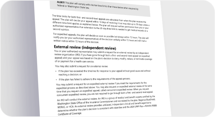 the member cost-share (coinsurance, if applicable). If WSRxS decides not to cover the prescription drug (denies the appeal), you are responsible for the full cost of the drug. If you disagree with the expedited appeal decision, you or your provider may request an expedited external review (see the “External review (independent review)” section below). Time limits for the plan to decide appeals ALERT! The plan will comply with shorter time limits than those below when required by federal or Washington State law. The time limits for both first- and second-level appeals are calculated from when the plan receives the appeal. The plan will decide your appeal within 14 days of receiving it but may take up to 30 days unless a different time limit applies as explained below. The plan will request written permission from you or your authorized representative if an extension to the 30-day time limit is needed to get medical records or a second opinion. For expedited appeals, the plan will decide as soon as possible but always within 72 hours. The plan will notify you (or your authorized representative) of the decision verbally within 72 hours and will mail a written notice within 72 hours of the decision. External review (independent review) You or your authorized representative may submit a request for an external review by an independent review organization (IRO) if you have gone through both a first- and second-level appeal (or expedited appeal) and your appeal was based on the plan’s decision to deny, modify, reduce, or terminate coverage of or payment for a health care service. You may also submit a request for an external review: • If the plan has exceeded the timelines for response to your appeal without good cause and without reaching a decision; or • If the plan has failed to adhere to the requirements of the appeals process. You may submit a request for an expedited external review if you meet the requirements for the expedited process as described above. You may also request an expedited external review at the same time that you request an expedited appeal, called concurrent expedited review. When you request concurrent expedited review, you are not required to go through both a first- and second-level appeal. An IRO will conduct the external review. An IRO is a group of medical and benefit experts certified by the Washington State Office of the Insurance Commissioner and not related to the plan, Regence BlueShield, WSRxS, or HCA. An external review provides unbiased, independent clinical and benefit expertise to determine whether the plan’s decision is consistent with state law and the 2024 UMP Plus––PSHVN (PEBB) Certificate of Coverage. Requesting an external review To request an external review, see the contact information listed in the “Where to send complaints or appeals” section below. You or your authorized representative must submit a request for an external review no more than 180 days after you receive the letter responding to your second-level appeal (or expedited appeal). Only the member or an authorized representative may submit a request for an external review. You may authorize 2024 UMP Plus–PSHVN (PEBB) Certificate of Coverage 129