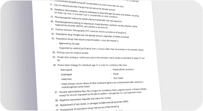 72. Noncovered provider types: Services delivered by providers not listed as a covered provider type (see page 19) 73. Novocure (i.e., Optune) (tumor treating fields) 74. Orthoptic therapy except for the diagnosis of strabismus, a muscle disorder of the eye 75. Orthotics, foot or shoe: Items such as shoe inserts and other shoe modifications, except as specified on page 53 76. Osteochondral allograft/autograft transplantation for joints other than the knee 77. Out-of-network provider charges that are above the allowed amount 78. Peripheral nerve ablation, using any technique, to treat limb pain for adults and children, including for knee, hip, foot, or shoulder due to osteoarthritis or other conditions 79. Pharmacogenetic testing for patients being treated with oral anticoagulants 80. Pharmacogenomics testing for depression, mood disorders, psychosis, anxiety, attention deficit hyperactivity disorder (ADHD), and substance use disorder 81. Positron Emission Tomography (PET) scans for routine surveillance of lymphoma 82. Prescription drug charges over the allowed amount, regardless of where purchased 83. Prescription drugs that require preauthorization, unless the request is: ◦ Approved by the plan ◦ Supported by medical justification from a clinician other than the member or the member’s family 84. Printing costs for medical records 85. Private duty nursing or continuous care in the member's home, except as described on pages 61 and 69 86. Proton beam therapy for individuals age 21 or older for conditions other than: ◦ Brain/spinal ◦ Hepatocellular carcinoma ◦ Esophageal ◦ Ocular ◦ Head/neck ◦ Skull-based ◦ Other primary cancers where all other treatment options are contraindicated after review by a multidisciplinary tumor board 87. Provider administrative fees: Any charges for completing forms, copying records, or finance charges, except for records requested by the plan to perform retrospective (i.e., post-payment) review 88. Repetitive transcranial magnetic stimulation for tinnitus 89. Replacement of lost, stolen, or damaged durable medical equipment (DME) 90. Replacement of prescription drugs that are any of the following: ◦ Confiscated or seized by Customs or ◦ Expired other authorities ◦ Lost or stolen ◦ Contaminated ◦ Ruined ◦ Damaged 91. Residential treatment programs offered at facilities that do not meet the definition of Residential Treatment Facility (see definition of “Residential treatment facility”) 112 2024 UMP Plus–PSHVN (PEBB) Certificate of Coverage