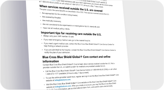 Submitting a Blue Cross Blue Shield Global® Core claim When you pay for covered health care services outside the BlueCard® service area, you must submit a claim to obtain reimbursement. For institutional and professional claims, complete a Blue Cross Blue Shield Global® Core claim form and send the claim form with the provider's itemized bill(s) to the service center (the address is on the form) to initiate claims processing. Following the instructions on the claim form will help ensure timely processing of your claim. The claim form is available from the claims administrator, the service center, or online at the Blue Cross Blue Shield Global Core® website at bcbsglobalcore.com. If you need assistance with your claim submission, you should call the service center at 1-800-810-BLUE (2583) or call collect at 1-804-673-1177, 24 hours a day, 7 days a week. When services received outside the U.S. are covered The plan covers the same benefits as described in this COC if the services received outside the U.S.: • Are appropriate for the condition being treated; • Are covered by the plan; • Are medically necessary; • Are not considered to be experimental or investigational by U.S. standards; and • Have met all medical policy criteria. Important tips for receiving care outside the U.S. • Always carry your UMP member ID card. • If you need emergency medical care, go to the nearest hospital. • If you need urgent medical care, contact the Blue Cross Blue Shield Global® Core Service Center for help finding a network provider. • If you are admitted to the hospital, contact the Blue Cross Blue Shield Global® Core Service Center to notify the plan of your admission. Blue Cross Blue Shield Global® Core contact and online information Contact Blue Cross Blue Shield Global® Core to learn about services received outside the U.S., find a provider outside the U.S., or submit a claim for medical care provided outside the U.S. • Call the Blue Cross Blue Shield Global® Core Service Center at 1-800-810-BLUE (2583), or call collect 1-804-673-1177 (available 24 hours a day, 7 days a week). • To use the online provider search tool, register and sign in on the Blue Cross Blue Shield Global® Core website at bcbsglobalcore.com. • Visit the Blue Cross Blue Shield Global® Core website on the Blue Cross Blue Shield Global® Core website at bcbsglobalcore.com. After you create an account, you may find Blue Cross Blue Shield Global® Core information, get an international claim form, and submit claims electronically. Finding a network provider outside the U.S. Under Blue Cross Blue Shield Global® Core, you have access to network providers outside the U.S., including hospital care (inpatient and outpatient) and professional provider services at network rates. To find a contracted provider outside the U.S., register and sign in on the Blue Cross Blue Shield Global® Core website at bcbsglobalcore.com or call the Blue Cross Blue Shield Global® Core Service Center: 1- 800-810-BLUE (2583) or collect at 1-804-673-1177. 28 2024 UMP Plus–PSHVN (PEBB) Certificate of Coverage