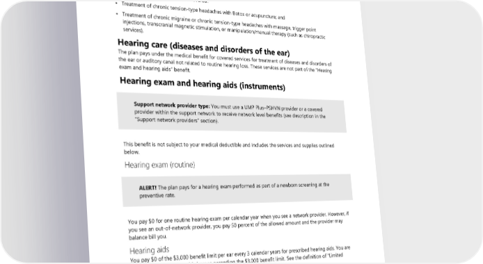 • The condition is appropriately managed for medication overuse. Botox injections must be discontinued when: • The condition has shown inadequate response to treatment (defined as less than 50 percent reduction in headache days per month after two treatment cycles); or • The member has received a maximum of five treatment cycles. The following treatments are not covered: • Treatment of chronic tension-type headaches with Botox or acupuncture; and • Treatment of chronic migraine or chronic tension-type headaches with massage, trigger point injections, transcranial magnetic stimulation, or manipulation/manual therapy (such as chiropractic services). Hearing care (diseases and disorders of the ear) The plan pays under the medical benefit for covered services for treatment of diseases and disorders of the ear or auditory canal not related to routine hearing loss. These services are not part of the “Hearing exam and hearing aids” benefit. Hearing exam and hearing aids (instruments) Support network provider type: You must use a UMP Plus–PSHVN provider or a covered provider within the support network to receive network level benefits (see description in the “Support network providers” section). This benefit is not subject to your medical deductible and includes the services and supplies outlined below. Hearing exam (routine) ALERT! The plan pays for a hearing exam performed as part of a newborn screening at the preventive rate. You pay $0 for one routine hearing exam per calendar year when you see a network provider. However, if you see an out-of-network provider, you pay 50 percent of the allowed amount and the provider may balance bill you. Hearing aids You pay $0 of the $3,000 benefit limit per ear every 3 calendar years for prescribed hearing aids. You are responsible for hearing aid charges exceeding the $3,000 benefit limit. See the definition of “Limited Benefit”. You pay the standard rate for the following hearing-related services: ▪ Ear mold(s) ▪ Initial battery, cords, and other ancillary equipment ▪ Warranty (only as included with the initial purchase) 2024 UMP Plus–PSHVN (PEBB) Certificate of Coverage 57