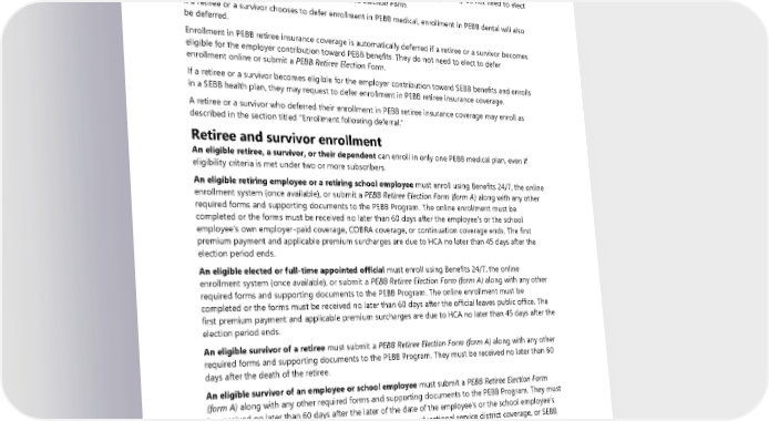 • Beginning July 17, 2018, enrollment in PEBB retiree insurance coverage may be deferred when the subscriber is enrolled in the Civilian Health and Medical Program of the Department of Veterans Affairs (CHAMPVA). Exception: A retiree may defer enrollment in PEBB retiree insurance coverage during the period of time they are enrolled as a dependent in a medical plan sponsored by PEBB or School Employees Benefits Board (SEBB), including such coverage under COBRA or continuation coverage. They do not need to elect to defer enrollment online or submit a PEBB Retiree Election Form. If a retiree or a survivor chooses to defer enrollment in PEBB medical, enrollment in PEBB dental will also be deferred. Enrollment in PEBB retiree insurance coverage is automatically deferred if a retiree or a survivor becomes eligible for the employer contribution toward PEBB benefits. They do not need to elect to defer enrollment online or submit a PEBB Retiree Election Form. If a retiree or a survivor becomes eligible for the employer contribution toward SEBB benefits and enrolls in a SEBB health plan, they may request to defer enrollment in PEBB retiree insurance coverage. A retiree or a survivor who deferred their enrollment in PEBB retiree insurance coverage may enroll as described in the section titled “Enrollment following deferral.” Retiree and survivor enrollment An eligible retiree, a survivor, or their dependent can enroll in only one PEBB medical plan, even if eligibility criteria is met under two or more subscribers. An eligible retiring employee or a retiring school employee must enroll using Benefits 24/7, the online enrollment system (once available), or submit a PEBB Retiree Election Form (form A) along with any other required forms and supporting documents to the PEBB Program. The online enrollment must be completed or the forms must be received no later than 60 days after the employee’s or the school employee’s own employer-paid coverage, COBRA coverage, or continuation coverage ends. The first premium payment and applicable premium surcharges are due to HCA no later than 45 days after the election period ends. An eligible elected or full-time appointed official must enroll using Benefits 24/7, the online enrollment system (once available), or submit a PEBB Retiree Election Form (form A) along with any other required forms and supporting documents to the PEBB Program. The online enrollment must be completed or the forms must be received no later than 60 days after the official leaves public office. The first premium payment and applicable premium surcharges are due to HCA no later than 45 days after the election period ends. An eligible survivor of a retiree must submit a PEBB Retiree Election Form (form A) along with any other required forms and supporting documents to the PEBB Program. They must be received no later than 60 days after the death of the retiree. An eligible survivor of an employee or school employee must submit a PEBB Retiree Election Form (form A) along with any other required forms and supporting documents to the PEBB Program. They must be received no later than 60 days after the later of the date of the employee’s or the school employee’s death, or the date the survivor’s PEBB insurance coverage, educational service district coverage, or SEBB insurance coverage ends. The first premium payment and applicable premium surcharges are due to HCA no later than 45 days after the election period ends. An eligible employee or school employee determined to be retroactively eligible for disability retirement must enroll using Benefits 24/7, the online enrollment system (once available), or submit a PEBB Retiree Election Form (form A) along with any other required forms, supporting documents, and their formal determination letter to the PEBB Program. The online enrollment must be completed or the forms 158 2024 UMP Plus–PSHVN (PEBB) Certificate of Coverage