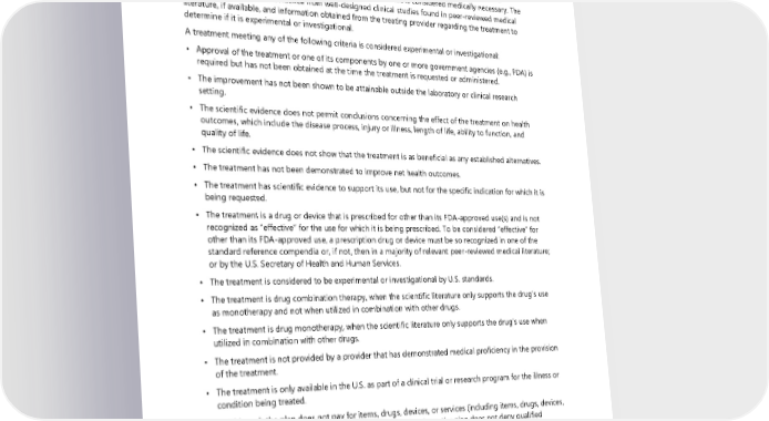 Experimental or investigational Experimental or investigational means any treatment that is not recognized by the plan as conforming to standard medical care for the condition, disease, illness, or injury being treated. ”Treatment” in this setting may include any intervention, therapy, procedure, facility, equipment, drug usage, device, service, supply, intervention, biologic product or drug (prescription or nonprescription). Experimental and investigational treatments are not covered, even if the treatment is considered medically necessary. The plan will review scientific evidence from well-designed clinical studies found in peer-reviewed medical literature, if available, and information obtained from the treating provider regarding the treatment to determine if it is experimental or investigational. A treatment meeting any of the following criteria is considered experimental or investigational: • Approval of the treatment or one of its components by one or more government agencies (e.g., FDA) is required but has not been obtained at the time the treatment is requested or administered. • The improvement has not been shown to be attainable outside the laboratory or clinical research setting. • The scientific evidence does not permit conclusions concerning the effect of the treatment on health outcomes, which include the disease process, injury or illness, length of life, ability to function, and quality of life. • The scientific evidence does not show that the treatment is as beneficial as any established alternatives. • The treatment has not been demonstrated to improve net health outcomes. • The treatment has scientific evidence to support its use, but not for the specific indication for which it is being requested. • The treatment is a drug or device that is prescribed for other than its FDA-approved use(s) and is not recognized as “effective” for the use for which it is being prescribed. To be considered “effective” for other than its FDA-approved use, a prescription drug or device must be so recognized in one of the standard reference compendia or, if not, then in a majority of relevant peer-reviewed medical literature; or by the U.S. Secretary of Health and Human Services. • The treatment is considered to be experimental or investigational by U.S. standards. • The treatment is drug combination therapy, when the scientific literature only supports the drug’s use as monotherapy and not when utilized in combination with other drugs. • The treatment is drug monotherapy, when the scientific literature only supports the drug’s use when utilized in combination with other drugs. • The treatment is not provided by a provider that has demonstrated medical proficiency in the provision of the treatment. • The treatment is only available in the U.S. as part of a clinical trial or research program for the illness or condition being treated. ▪ Although the plan does not pay for items, drugs, devices, or services (including items, drugs, devices, or services provided in a clinical trial) for investigational use, the plan does not deny qualified individuals from participating in approved clinical trials. The terms “qualified individual” and “approved clinical trial” are defined in 42 U.S.C. §300gg-8. If a qualified individual is participating in an approved clinical trial, the plan will not deny, limit, or impose additional conditions on the coverage for routine patient costs for items and services furnished in connection with participation in the trial and will not discriminate against the individual on the basis of the individual’s participation in such trial. The plan will apply its standard terms and conditions for routine patient costs for items and services furnished in connection with participation in the trial. 174 2024 UMP Plus–PSHVN (PEBB) Certificate of Coverage