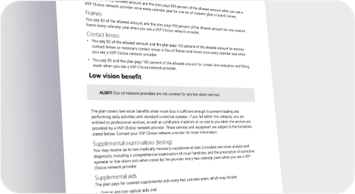 • Prescribing and ordering proper lenses; • Verifying the accuracy of the finished lenses; and • Progress or follow-up work as necessary. Vision hardware Lenses for glasses You pay $0 of the allowed amount and the plan pays 100 percent of the allowed amount when you see a VSP Choice network provider once every calendar year for one set of covered glass or plastic lenses. Frames You pay $0 of the allowed amount and the plan pays 100 percent of the allowed amount for one covered frame every calendar year when you see a VSP Choice network provider. Contact lenses • You pay $0 of the allowed amount and the plan pays 100 percent of the allowed amount for elective contact lenses or necessary contact lenses in lieu of frames and lenses once every calendar year when you see a VSP Choice network provider. • You pay $0 and the plan pays 100 percent of the allowed amount for contact lens evaluation and fitting exam when you see a VSP Choice network provider. Low vision benefit ALERT! Out-of-network providers are not covered for any low vision services. The plan covers low vision benefits when vision loss is sufficient enough to prevent reading and performing daily activities with standard corrective eyewear. If you fall within this category, you are entitled to professional services, as well as ophthalmic materials at no cost to you when the services are provided by a VSP Choice network provider. These services and equipment are subject to the limitations stated below. Contact your VSP Choice network provider for more information. Supplemental examinations (testing) You may receive up to two medically necessary supplemental tests (complete low vision analysis and diagnosis), including a comprehensive examination of visual functions, and the prescription of corrective eyewear or low vision aids when noted by the provider every two calendar years when you see a VSP Choice network provider. Supplemental aids The plan pays for covered supplemental aids every two calendar years, which may include: • Optical and non-optical aids; and • Training on how to use the aids. Vision claims administration This section explains how VSP administers claims. 2024 UMP Plus–PSHVN (PEBB) Certificate of Coverage 83