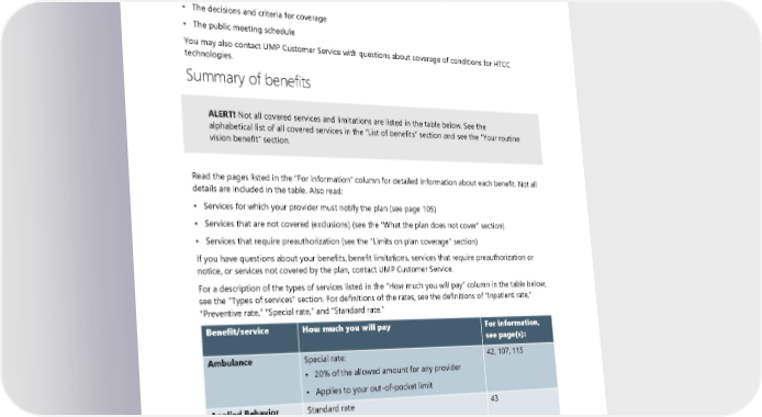 Where to find HTCC decisions You may view the list of services that the HTCC has reviewed or currently has under review on the HCA website at hca.wa.gov/hta. The website includes: • Evidence reports • Instructions on providing public comments on pending reviews or re-reviews • Public comments • The decisions and criteria for coverage • The public meeting schedule You may also contact UMP Customer Service with questions about coverage of conditions for HTCC technologies. Summary of benefits ALERT! Not all covered services and limitations are listed in the table below. See the alphabetical list of all covered services in the “List of benefits” section and see the “Your routine vision benefit” section. Read the pages listed in the “For information” column for detailed information about each benefit. Not all details are included in the table. Also read: • Services for which your provider must notify the plan (see page 105) • Services that are not covered (exclusions) (see the “What the plan does not cover” section) • Services that require preauthorization (see the “Limits on plan coverage” section) If you have questions about your benefits, benefit limitations, services that require preauthorization or notice, or services not covered by the plan, contact UMP Customer Service. For a description of the types of services listed in the “How much you will pay” column in the table below, see the “Types of services” section. For definitions of the rates, see the definitions of “Inpatient rate,” “Preventive rate,” “Special rate,” and “Standard rate.” Benefit/service How much you will pay For information, see page(s): Ambulance Special rate: 42, 107, 115 • 20% of the allowed amount for any provider • Applies to your out-of-pocket limit Applied Behavior Standard rate 43 Analysis (ABA) Therapy 2024 UMP Plus–PSHVN (PEBB) Certificate of Coverage 39