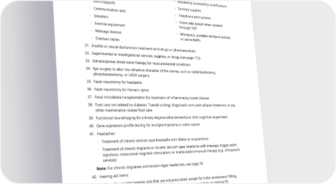 28. Electrical Neural Stimulation (ENS), which includes Transcutaneous Electrical Nerve Stimulation (TENS) units, outside of medically supervised facility settings (e.g., in-home use). 29. Email consultations or e-visits, except as described under the telemedicine benefit. 30. Equipment not primarily intended to improve a medical condition or injury, including, but not limited to: ◦ Air conditioners or air purifying systems ◦ Residential accessibility modifications ◦ Arch supports ◦ Sanitary supplies ◦ Communication aids ◦ Telephone alert systems ◦ Elevators ◦ Vision aids except when covered ◦ Exercise equipment through VSP ◦ Massage devices ◦ Whirlpools, portable whirlpool pumps, ◦ Overbed tables or sauna baths 31. Erectile or sexual dysfunction treatment with drugs or pharmaceuticals 32. Experimental or investigational services, supplies, or drugs (see page 173) 33. Extracorporeal shock wave therapy for musculoskeletal conditions 34. Eye surgery to alter the refractive character of the cornea, such as radial keratotomy, photokeratectomy, or LASIK surgery 35. Facet neurotomy for headache 36. Facet neurotomy for thoracic spine 37. Fecal microbiota transplantation for treatment of inflammatory bowel disease 38. Foot care not related to diabetes: Toenail cutting; diagnosed corns and calluses treatment; or any other maintenance-related foot care 39. Functional neuroimaging for primary degenerative dementia or mild cognitive impairment 40. Gene expression profile testing for multiple myeloma or colon cancer 41. Headaches: ◦ Treatment of chronic tension-type headache with Botox or acupuncture ◦ Treatment of chronic migraine or chronic tension-type headache with massage, trigger point injections, transcranial magnetic stimulation, or manipulation/manual therapy (e.g., chiropractic services) Note: For chronic migraines and tension-type headaches, see page 56 42. Hearing aid items: ◦ Over-the-counter hearing aids that are not prescribed. except for initial assessment, fitting, adjustment, auditory training, and ear molds as necessary to maintain an optimal fit ◦ Charges incurred after your plan coverage ends, unless you ordered the hearing aid before that date and it is delivered within 45 days after your coverage ended ◦ Extended warranties, or warranties not related to the initial purchase of the hearing aid(s) ◦ Purchase of replacement batteries or other ancillary equipment, except those covered under terms of the initial hearing aid purchase 2024 UMP Plus–PSHVN (PEBB) Certificate of Coverage 109