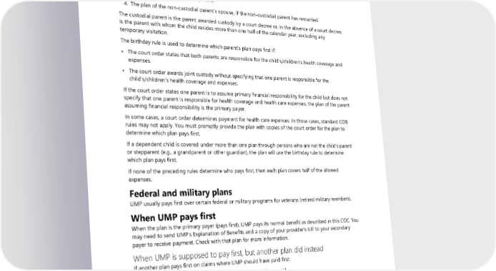 Dependent children of legally separated or divorced parents When no court order specifies which parent is responsible for providing health insurance coverage, the following standard COB rules determine which plan pays first: 1. The plan of the custodial parent. 2. The plan of the custodial parent’s spouse, if the custodial parent has remarried. 3. The plan of the non-custodial parent. 4. The plan of the non-custodial parent’s spouse, if the non-custodial parent has remarried. The custodial parent is the parent awarded custody by a court decree or, in the absence of a court decree, is the parent with whom the child resides more than one half of the calendar year, excluding any temporary visitation. The birthday rule is used to determine which parent’s plan pays first if: • The court order states that both parents are responsible for the child’s/children’s health coverage and expenses. • The court order awards joint custody without specifying that one parent is responsible for the child’s/children’s health coverage and expenses. If the court order states one parent is to assume primary financial responsibility for the child but does not specify that one parent is responsible for health coverage and health care expenses, the plan of the parent assuming financial responsibility is the primary payer. In some cases, a court order determines payment for health care expenses. In those cases, standard COB rules may not apply. You must promptly provide the plan with copies of the court order for the plan to determine which plan pays first. If a dependent child is covered under more than one plan through persons who are not the child’s parent or stepparent (e.g., a grandparent or other guardian), the plan will use the birthday rule to determine which plan pays first. If none of the preceding rules determine who pays first, then each plan covers half of the allowed expenses. Federal and military plans UMP usually pays first over certain federal or military programs for veterans (retired military members). When UMP pays first When the plan is the primary payer (pays first), UMP pays its normal benefit as described in this COC. You may need to send UMP’s Explanation of Benefits and a copy of your provider’s bill to your secondary payer to receive payment. Check with that plan for more information. When UMP is supposed to pay first, but another plan did instead If another plan pays first on claims where UMP should have paid first: • UMP may pay the other plan the amount UMP should have paid. • Amounts UMP pays to the other plan are considered benefits paid by UMP. How UMP coordinates benefits when it pays second UMP uses a type of COB called nonduplication of benefits (see definition of “Nonduplication of benefits”). When UMP pays second to another plan that covers the member, UMP will pay only an amount needed to bring the total benefit up to the amount UMP would have paid if the member did not have another plan. 2024 UMP Plus–PSHVN (PEBB) Certificate of Coverage 119