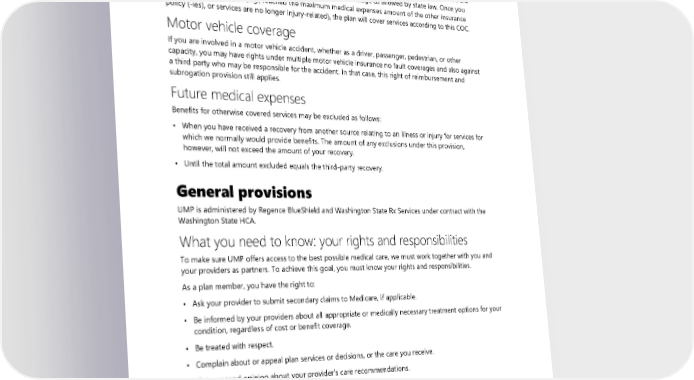 Services covered by other insurance The plan does not cover services that are covered by other insurance, including, but not limited to, no fault automobile medical payments (Med-Pay), no fault automobile personal injury protection (PIP), homeowner’s no-fault coverage, commercial premises no fault medical coverage, or sports policies, including excess, underinsured or uninsured motorist coverage or similar contract or insurance. You are responsible for any cost-sharing required under the other coverage as allowed by state law. Once you have exhausted benefits (e.g., reached the maximum medical expenses amount of the other insurance policy (-ies), or services are no longer injury-related), the plan will cover services according to this COC. Motor vehicle coverage If you are involved in a motor vehicle accident, whether as a driver, passenger, pedestrian, or other capacity, you may have rights under multiple motor vehicle insurance no fault coverages and also against a third party who may be responsible for the accident. In that case, this right of reimbursement and subrogation provision still applies. Future medical expenses Benefits for otherwise covered services may be excluded as follows: • When you have received a recovery from another source relating to an illness or injury for services for which we normally would provide benefits. The amount of any exclusions under this provision, however, will not exceed the amount of your recovery. • Until the total amount excluded equals the third-party recovery. General provisions UMP is administered by Regence BlueShield and Washington State Rx Services under contract with the Washington State HCA. What you need to know: your rights and responsibilities To make sure UMP offers access to the best possible medical care, we must work together with you and your providers as partners. To achieve this goal, you must know your rights and responsibilities. As a plan member, you have the right to: • Ask your provider to submit secondary claims to Medicare, if applicable. • Be informed by your providers about all appropriate or medically necessary treatment options for your condition, regardless of cost or benefit coverage. • Be treated with respect. • Complain about or appeal plan services or decisions, or the care you receive. • Get a second opinion about your provider’s care recommendations. • Have a translator’s assistance, if required, when contacting the plan. • Keep your medical records and personal information confidential as described in the UMP Notice of Privacy Practices, available online on the HCA website at hca.wa.gov/ump-privacy. • Make decisions with your providers about your health care. • Make recommendations about member rights and responsibilities. 2024 UMP Plus–PSHVN (PEBB) Certificate of Coverage 133