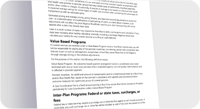 When covered services are received outside the Regence’s service area and the claim is processed through the BlueCard® Program, the amount you pay for covered services is calculated based on the lower of: • The billed covered charges for your covered services; or • The negotiated price that the Host Blue makes available to Regence. Often, this “negotiated price” will be a simple discount that reflects an actual price that the Host Blue pays to your health care provider. Sometimes, it is an estimated price that considers special arrangements with your health care provider or provider group that may include types of settlements, incentive payments, and/or other credits or charges. Occasionally, it may be an average price, based on a discount that results in expected average savings for similar types of health care providers after considering the same types of transactions as with an estimated price. Estimated pricing and average pricing, going forward, also take into account adjustments to correct for over- or underestimation of modifications of past pricing of claims, as noted above. However, such adjustments will not affect the price Regence BlueShield uses for your claim because they will not be applied after a claim has already been paid. Laws in a small number of states may require the Host Blue to add a surcharge to your calculation. If any state laws mandate other liability calculation methods, including a surcharge, Regence would then calculate your liability for any covered services according to applicable law. Value Based Programs If covered services are received under a Value-Based Program inside a Host Blue's service area, you will not be responsible for paying any of the provider incentives, risk-sharing, and/or care coordinator fees that are a part of such an arrangement, except when a Host Blue passes these fees to the Regence through average pricing or fee schedule adjustments. For the purpose of this section, the following definitions apply. Value-Based Program: An outcomes-based payment arrangement and/or a coordinated care model facilitated with one or more local providers that is evaluated against cost and quality metrics/factors and is reflected in provider payment. Provider Incentive: An additional amount of compensation paid to a healthcare provider by a Blue Cross and/or Blue Shield Plan, based on the provider's compliance with agreed-upon procedural and/or outcome measures for a particular group of covered persons. A Care Coordination Fee is a fixed amount paid by a Blue Cross and/or Blue Shield Licensee to Providers periodically for Care Coordination under a Value-Based Program. Inter-Plan Programs: Federal or state taxes, surcharges, or fees Federal law or state law may require a surcharge, tax or other fee that applies to self-insured accounts. If applicable, any such surcharge, tax or other fee will be included as part of the claim fee passed on to the claimant. Out-of-network providers outside Regence’s service area Member liability When covered services are provided outside of Regence’s service area by out-of-network providers, the amount you pay for such services will generally be based on either the Host Blue’s out-of-network provider local payment or the pricing arrangements required by applicable state law. In these situations, you may be liable for the difference between the amount that the out-of-network provider bills and the 26 2024 UMP Plus–PSHVN (PEBB) Certificate of Coverage