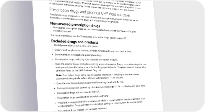 If a network pharmacy (including mail-order or specialty drug) tells you that preauthorization is required, coverage is denied, or quantities are limited, you, your pharmacist, or your prescribing provider may contact WSRxS Customer Service to request a coverage review or preauthorization. If WSRxS denies the coverage request, you have the right to submit an appeal (see the “Complaint and appeal procedures” section). If your provider thinks you need the prescription drug immediately, they may request an expedited review by submitting all clinically relevant information to the plan by phone or fax. An expedited appeal replaces the first and second level appeals. WSRxS will decide on coverage of the prescription drug within 72 hours of the request. In this case, you may choose to purchase a three-day supply at your own expense. Prescription drugs and products UMP does not cover Prescription drugs and products not covered under the prescription drug benefit include, but are not limited to, noncovered prescription drugs and excluded drugs and products. Noncovered prescription drugs • Noncovered prescription drugs are not covered without an approved UMP Preferred Drug List exception request For more information, see the “Noncovered prescription drugs” section on page 86. Excluded drugs and products • Dental preparations, such as rinses and pastes. • Dietary/food supplements, vitamins, minerals, herbal supplements, and medical foods. • Experimental or investigational prescription drugs. • Homeopathic drugs, including FDA-approved prescription products. • Over-the-counter drugs, products containing an over-the-counter drug, or prescription drugs that have a nonprescription alternative, except for the drugs specified under “Exceptions covered” on page 89, or otherwise listed on the UMP Preferred Drug List. Note: Prescription drugs with a nonprescription alternative — including an over-the-counter alternative having similar safety, efficacy, and ingredients — are excluded. • Over-the-counter products not approved by and registered with the FDA. • Prescription drug costs covered by other insurance (see page 121 for coordination with other plans). • Prescription drugs not approved by the FDA. • Prescription drugs prescribed for excluded conditions. • Prescription drugs provided to a member, in whole or in part, while the member is admitted to an inpatient facility. Drugs provided in an inpatient setting are covered under the medical benefit. • Prescription drugs that are not medically necessary. • Prescription drugs that are repackaged. • Prescription drugs that the FDA’s DESI classifications have found to be less than effective. • Prescription drugs under a REMS program required by the FDA when prescribed outside REMS guidelines (see page 98 for details). • Most products considered as a medical device by the FDA. Medical devices may be covered under your medical benefit. 2024 UMP Plus–PSHVN (PEBB) Certificate of Coverage 103