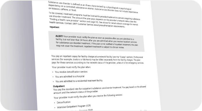 Substance use disorder Support network provider type: You must use a UMP Plus–PSHVN provider or a covered provider within the support network to receive network level benefits (see description in the “Support network providers” section). Substance use disorder is defined as an illness characterized by a physiological or psychological dependency on a controlled substance or alcohol. Substance use disorder does not include dependence on tobacco, caffeine, or food. To be covered, treatment programs must be licensed to provide treatment to persons requiring substance use disorder treatment. The amount the plan pays depends on the provider’s network status (see the “Finding a health care provider” section and page 35). See above for details about coverage for mental health services. Contact UMP Customer Service about preauthorization requirements. Inpatient ALERT! Your provider must notify the plan as soon as possible after you are admitted to a facility, but not later than 24 hours after you are admitted when you receive inpatient services for substance use disorder treatment. If the plan is not notified of inpatient treatment, the plan may not cover the treatment. Inpatient treatment is subject to clinical review. You pay an inpatient copay for facility charges at a network facility (see the “Copay” section). Professional services (for example, doctors or lab tests) may be billed separately from the facility charges. The plan pays for these services according to the network status of the provider, unless it is for emergency services. Your provider must notify the plan when: • You receive detoxification services • You are admitted to a hospital • You are admitted to a residential treatment facility Outpatient You pay the standard rate for outpatient substance use disorder treatment. You pay based on the allowed amount and the network status of the provider. Your provider must notify the plan when you receive the following services: • Detoxification • Intensive Outpatient Program (IOP) • Partial Hospitalization Program (PHP) Preauthorization for outpatient substance use disorder treatment is not required in most cases. The plan may require that your provider submit a treatment plan to determine medical necessity. Behavioral health support resources UMP provides behavioral health support resources to meet your needs. 46 2024 UMP Plus–PSHVN (PEBB) Certificate of Coverage