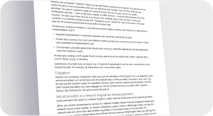 If you receive a higher-cost service or device at a hospital when a less expensive, medically appropriate option is available, you may have to pay the difference in cost. A network hospital cannot charge you for the difference in cost between the standard and higher-cost item (unless you agreed in writing to pay before receiving the services). If benefits change under the plan while you are in the hospital (or any other facility as an inpatient), coverage is based on the benefit in effect when the stay began. Inpatient Services are considered “inpatient” when you are admitted as inpatient to a hospital. Your provider must notify the plan as soon as possible after you are admitted, but not later than 24 hours after you are admitted. You pay an inpatient copay at a network facility. See the “Copay” section for details. Professional services — such as lab tests, surgery, or other services — may be billed separate from the hospital. The plan pays these services according to the network status of the provider, unless your condition is a medical emergency (see the “Emergency room" benefit for more information). The plan pays for all covered professional services at the standard rate. Private duty nursing furnished by a licensed home health agency may be substituted as an alternative to hospitalization only if: • Inpatient hospitalization is medically necessary and would be covered by the plan; • Private duty nursing is the most cost-effective setting (private duty nursing must be an equal or lesser cost compared to hospitalization); and • The member's provider agrees that private duty nursing is medically appropriate and will adequately meet the member's needs. Private duty nursing is shift-based, hourly nursing care at home for adults and children, typically with a chronic illness, injury, or disability. Substitution of private duty nursing in lieu of inpatient hospitalization has the same requirements as the hospital benefit. For example, all deductibles and coinsurances apply. Outpatient Services are considered “outpatient” when you are not admitted to the hospital. Your cost depends on the services provided, such as lab tests, and the network status of the provider(s) involved in your care. You do not pay the inpatient copay for outpatient services. Some services require preauthorization. Visit the UMP Policies that affect your care webpage for the list of these services, or contact UMP Customer Service. See Directory for link and contact information. Not all providers at a network hospital are network providers Some providers who work in a network hospital or other network facility may not be network providers. When you receive nonemergency services at a network hospital, network hospital outpatient department, network critical access hospital, or network ambulatory surgical center in Washington State, you pay the network rate and cannot be balance billed regardless of the network status of the provider. For nonemergency services performed at one of these facilities outside of Washington State, you still pay the network rate, but in some states, an out-of-network provider may be allowed to ask you to waive some of your balance billing protections. Knee arthroplasty, total Covered services are paid at the standard rate. Computer navigated and unicompartmental knee arthroplasty for treatment of end-stage osteoarthritis and rheumatoid arthritis of the knee are covered only as follows: 2024 UMP Plus–PSHVN (PEBB) Certificate of Coverage 61