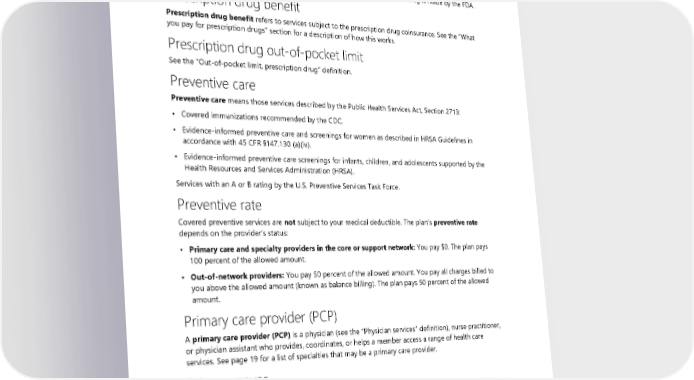 See the “Your prescription drug out-of-pocket limit” section for annual limits to covered prescription drug costs. Prescription drug Prescription drug means a drug approved by the FDA that can be dispensed only with an order given by a properly authorized person. The designation of a medication as a prescription drug is made by the FDA. Prescription drug benefit Prescription drug benefit refers to services subject to the prescription drug coinsurance. See the “What you pay for prescription drugs” section for a description of how this works. Prescription drug out-of-pocket limit See the “Out-of-pocket limit, prescription drug” definition. Preventive care Preventive care means those services described by the Public Health Services Act, Section 2713: • Covered immunizations recommended by the CDC. • Evidence-informed preventive care and screenings for women as described in HRSA Guidelines in accordance with 45 CFR §147.130 (a)(iv). • Evidence-informed preventive care screenings for infants, children, and adolescents supported by the Health Resources and Services Administration (HRSA). Services with an A or B rating by the U.S. Preventive Services Task Force. Preventive rate Covered preventive services are not subject to your medical deductible. The plan’s preventive rate depends on the provider’s status: • Primary care and specialty providers in the core or support network: You pay $0. The plan pays 100 percent of the allowed amount. • Out-of-network providers: You pay 50 percent of the allowed amount. You pay all charges billed to you above the allowed amount (known as balance billing). The plan pays 50 percent of the allowed amount. Primary care provider (PCP) A primary care provider (PCP) is a physician (see the “Physician services” definition), nurse practitioner, or physician assistant who provides, coordinates, or helps a member access a range of health care services. See page 19 for a list of specialties that may be a primary care provider. Primary payer The primary payer is the insurance plan that processes the claim first when a member has more than one group insurance plan covering the services and the plans must coordinate benefits. 186 2024 UMP Plus–PSHVN (PEBB) Certificate of Coverage