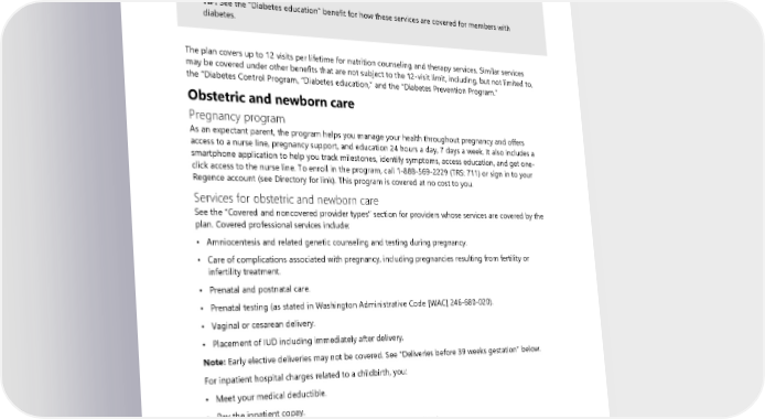 Nutrition counseling and therapy Support network provider type: You must use a UMP Plus–PSHVN provider or a covered provider within the support network to receive network level benefits (see description in the “Support network providers” section). TIP: See the “Diabetes education” benefit for how these services are covered for members with diabetes. The plan covers up to 12 visits per lifetime for nutrition counseling and therapy services. Similar services may be covered under other benefits that are not subject to the 12-visit limit, including, but not limited to, the “Diabetes Control Program, “Diabetes education,” and the “Diabetes Prevention Program.” Obstetric and newborn care Pregnancy program As an expectant parent, the program helps you manage your health throughout pregnancy and offers access to a nurse line, pregnancy support, and education 24 hours a day, 7 days a week. It also includes a smartphone application to help you track milestones, identify symptoms, access education, and get one- click access to the nurse line. To enroll in the program, call 1-888-569-2229 (TRS: 711) or sign in to your Regence account (see Directory for link). This program is covered at no cost to you. Services for obstetric and newborn care See the “Covered and noncovered provider types” section for providers whose services are covered by the plan. Covered professional services include: • Amniocentesis and related genetic counseling and testing during pregnancy. • Care of complications associated with pregnancy, including pregnancies resulting from fertility or infertility treatment. • Prenatal and postnatal care. • Prenatal testing (as stated in Washington Administrative Code [WAC] 246-680-020). • Vaginal or cesarean delivery. • Placement of IUD including immediately after delivery. Note: Early elective deliveries may not be covered. See “Deliveries before 39 weeks gestation” below. For inpatient hospital charges related to a childbirth, you: • Meet your medical deductible. • Pay the inpatient copay. • Pay the coinsurance for professional services while hospitalized. • Meet your medical deductible for the newborn. However, if only covered preventive care services (see page 66) are billed for the newborn, you will not meet your newborn’s medical deductible, pay the inpatient copay, or pay the coinsurance when you see a network provider. For hospitalization of the newborn, you will also pay a separate inpatient copay for the newborn. 64 2024 UMP Plus–PSHVN (PEBB) Certificate of Coverage