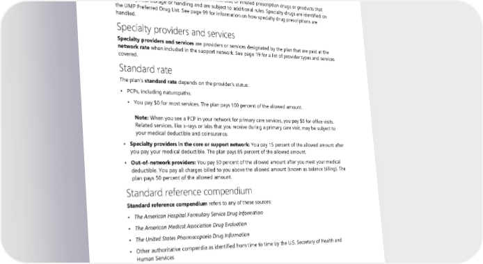 Special rate The plan’s special rate is for services that have unique payment rules. These rules are described in the table (see the “How much you pay for covered services” column) located in the “Types of services” section. Specialty drugs Specialty drugs are high-cost injectable, infused, oral, or inhaled prescription drugs or products that require special storage or handling and are subject to additional rules. Specialty drugs are identified on the UMP Preferred Drug List. See page 99 for information on how specialty drug prescriptions are handled. Specialty providers and services Specialty providers and services are providers or services designated by the plan that are paid at the network rate when included in the support network. See page 19 for a list of provider types and services covered. Standard rate The plan’s standard rate depends on the provider’s status: • PCPs, including naturopaths: ▪ You pay $0 for most services. The plan pays 100 percent of the allowed amount. Note: When you see a PCP in your network for primary care services, you pay $0 for office visits. Related services, like x-rays or labs that you receive during a primary care visit, may be subject to your medical deductible and coinsurance. • Specialty providers in the core or support network: You pay 15 percent of the allowed amount after you pay your medical deductible. The plan pays 85 percent of the allowed amount. • Out-of-network providers: You pay 50 percent of the allowed amount after you meet your medical deductible. You pay all charges billed to you above the allowed amount (known as balance billing). The plan pays 50 percent of the allowed amount. Standard reference compendium Standard reference compendium refers to any of these sources: • The American Hospital Formulary Service Drug Information • The American Medical Association Drug Evaluation • The United States Pharmacopoeia Drug Information • Other authoritative compendia as identified from time to time by the U.S. Secretary of Health and Human Services State Agency State agency means an office, department, board, commission, institution, or other separate unit or division, however designated, of the Washington state government. It includes the legislature, executive branch, and agencies or courts within the judicial branch, as well as institutions of higher education and any unit of state government established by law. 190 2024 UMP Plus–PSHVN (PEBB) Certificate of Coverage