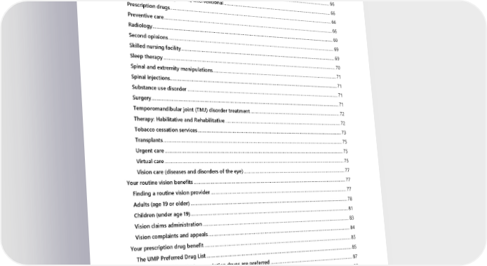 Nurse line .................................................................................................................................................................................... 63 Nutrition counseling and therapy ................................................................................................................................... 64 Obstetric and newborn care ............................................................................................................................................... 64 Office visits ................................................................................................................................................................................. 66 Orthognathic and Telegnathic surgery ......................................................................................................................... 66 Pain and joint management, interventional ............................................................................................................... 66 Prescription drugs................................................................................................................................................................... 66 Preventive care ......................................................................................................................................................................... 66 Radiology .................................................................................................................................................................................... 69 Second opinions ...................................................................................................................................................................... 69 Skilled nursing facility ........................................................................................................................................................... 69 Sleep therapy ............................................................................................................................................................................ 70 Spinal and extremity manipulations............................................................................................................................... 71 Spinal injections ....................................................................................................................................................................... 71 Substance use disorder ........................................................................................................................................................ 71 Surgery ......................................................................................................................................................................................... 71 Temporomandibular joint (TMJ) disorder treatment ............................................................................................. 72 Therapy: Habilitative and Rehabilitative ...................................................................................................................... 72 Tobacco cessation services ................................................................................................................................................. 73 Transplants ................................................................................................................................................................................. 75 Urgent care ................................................................................................................................................................................ 75 Virtual care ................................................................................................................................................................................. 75 Vision care (diseases and disorders of the eye) ........................................................................................................ 77 Your routine vision benefits ........................................................................................................................................................ 77 Finding a routine vision provider ......................................................................................................................................... 77 Adults (age 19 or older) ............................................................................................................................................................ 78 Children (under age 19) ............................................................................................................................................................. 81 Vision claims administration .................................................................................................................................................. 83 Vision complaints and appeals .............................................................................................................................................. 84 Your prescription drug benefit .................................................................................................................................................. 85 The UMP Preferred Drug List ................................................................................................................................................. 85 How UMP decides which prescription drugs are preferred ..................................................................................... 87 Guidelines for prescription drugs UMP covers .............................................................................................................. 88 What you pay for prescription drugs .........................................................................................