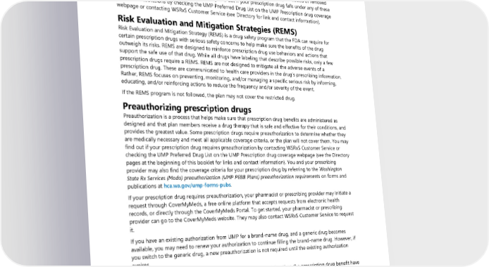 The plan excludes experimental or investigational prescription drugs. You may be liable for all charges if you receive prescription drugs or products that are determined to be experimental or investigational (see the “What the plan does not cover” section). If you disagree with the plan’s determination, you have the right to an appeal (see the “Complaint and appeal procedures” section for that process). The limits and restrictions described in the “Limits on your prescription drug coverage” section help WSRxS monitor drug usage, safety, and costs. These limits and restrictions may be added or removed from prescription drugs at any time. You may find out if your prescription drug falls under any of these limits and restrictions by checking the UMP Preferred Drug List on the UMP Prescription drug coverage webpage or contacting WSRxS Customer Service (see Directory for link and contact information). Risk Evaluation and Mitigation Strategies (REMS) Risk Evaluation and Mitigation Strategy (REMS) is a drug safety program that the FDA can require for certain prescription drugs with serious safety concerns to help make sure the benefits of the drug outweigh its risks. REMS are designed to reinforce prescription drug use behaviors and actions that support the safe use of that drug. While all drugs have labeling that describe possible risks, only a few prescription drugs require a REMS. REMS are not designed to mitigate all the adverse events of a prescription drug. These are communicated to health care providers in the drug’s prescribing information. Rather, REMS focuses on preventing, monitoring, and/or managing a specific serious risk by informing, educating, and/or reinforcing actions to reduce the frequency and/or severity of the event. If the REMS program is not followed, the plan may not cover the restricted drug. Preauthorizing prescription drugs Preauthorization is a process that helps make sure that prescription drug benefits are administered as designed and that plan members receive a drug therapy that is safe and effective for their conditions, and provides the greatest value. Some prescription drugs require preauthorization to determine whether they are medically necessary and meet all applicable coverage criteria, or the plan will not cover them. You may find out if your prescription drug requires preauthorization by contacting WSRxS Customer Service or checking the UMP Preferred Drug List on the UMP Prescription drug coverage webpage (see the Directory pages at the beginning of this booklet for links and contact information). You and your prescribing provider may also find the coverage criteria for your prescription drug by referring to the Washington State Rx Services (Moda) preauthorization (UMP PEBB Plans) preauthorization requirements on forms and publications at hca.wa.gov/ump-forms-pubs. If your prescription drug requires preauthorization, your pharmacist or prescribing provider may initiate a request through CoverMyMeds, a free online platform that accepts requests from electronic health records, or directly through the CoverMyMeds Portal. To get started, your pharmacist or prescribing provider can go to the CoverMyMeds website. They may also contact WSRxS Customer Service to request it. If you have an existing authorization from UMP for a brand-name drug, and a generic drug becomes available, you may need to renew your authorization to continue filling the brand-name drug. However, if you switch to the generic drug, a new preauthorization is not required until the existing authorization expires. Note: Prescription drugs covered under the medical benefit rather than the prescription drug benefit have different rules for preauthorization. Contact UMP Customer Service for details. Emergency fill Emergency fill lets you get a limited quantity of certain prescription drugs while the plan processes your preauthorization request. This option is only available when a delay could result in emergency care, 98 2024 UMP Plus–PSHVN (PEBB) Certificate of Coverage