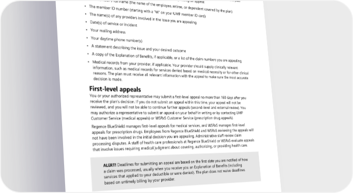 plan will ask your permission if it needs more time to respond. You can access the UMP (Regence) Medical appeals and grievance form by visiting forms and publications at hca.wa.gov/ump-forms-pubs. Information to provide with an appeal You can submit information, documents, written comments, records, evidence, and testimony, including second opinions, with your appeal. When you provide all the necessary documentation, it allows the plan to review your appeal faster. Include the following when requesting an appeal: • The member’s full name (the name of the employee, retiree, or dependent covered by the plan) • The member ID number (starting with a “W” on your UMP member ID card) • The name(s) of any providers involved in the issue you are appealing • Date(s) of service or incident • Your mailing address • Your daytime phone number(s) • A statement describing the issue and your desired outcome • A copy of the Explanation of Benefits, if applicable, or a list of the claim numbers you are appealing • Medical records from your provider, if applicable. Your provider should supply clinically relevant information, such as medical records for services denied based on medical necessity or for other clinical reasons. The plan must receive all relevant information with the appeal to make sure the most accurate decision is made. First-level appeals You or your authorized representative may submit a first-level appeal no more than 180 days after you receive the plan’s decision. If you do not submit an appeal within this time, your appeal will not be reviewed, and you will not be able to continue further appeals (second-level and external review). You may authorize a representative to submit an appeal on your behalf in writing or by contacting UMP Customer Service (medical appeals) or WSRxS Customer Service (prescription drug appeals). Regence BlueShield manages first-level appeals for medical services, and WSRxS manages first-level appeals for prescription drugs. Employees from Regence BlueShield and WSRxS reviewing the appeals will not have been involved in the initial decision you are appealing. Administrative staff review claim processing disputes. A staff of health care professionals at Regence BlueShield or WSRxS evaluate appeals that involve issues requiring medical judgment about covering, authorizing, or providing health care. ALERT! Deadlines for submitting an appeal are based on the first date you are notified of how a claim was processed, usually when you receive you an Explanation of Benefits (including services that applied to your deductible or were denied). The plan does not waive deadlines based on untimely billing by your provider. Second-level appeals If you disagree with the decision made on your first-level appeal, you or your authorized representative may submit a second-level appeal. You must submit second-level appeals no more than 180 days after you receive the letter responding to your first-level appeal. If you do not submit an appeal within this time, your appeal will not be reviewed, and you will not be able to continue further appeals (external review). You may authorize a representative to submit an appeal on your behalf in writing or by 2024 UMP Plus–PSHVN (PEBB) Certificate of Coverage 127