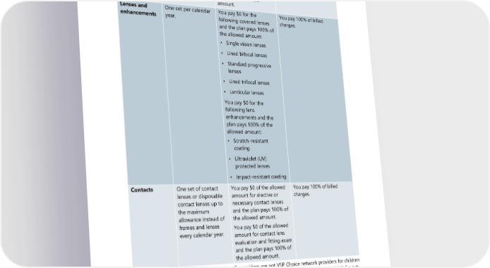 Benefit Frequency Your cost with a VSP Your cost with an out-of- Choice network network provider provider Frames One per calendar You pay $0 of the allowed You pay 100% of billed year. amount and the plan pays charges. 100% of the allowed amount. Lenses and One set per calendar You pay $0 for the You pay 100% of billed enhancements year. following covered lenses charges. and the plan pays 100% of the allowed amount: • Single vision lenses • Lined bifocal lenses • Standard progressive lenses • Lined trifocal lenses • Lenticular lenses You pay $0 for the following lens enhancements and the plan pays 100% of the allowed amount: • Scratch-resistant coating • Ultraviolet (UV) protected lenses • Impact-resistant coating Contacts One set of contact You pay $0 of the allowed You pay 100% of billed lenses or disposable amount for elective or charges. contact lenses up to necessary contact lenses the maximum and the plan pays 100% of allowance instead of the allowed amount. frames and lenses You pay $0 of the allowed every calendar year. amount for contact lens evaluation and fitting exam and the plan pays 100% of the allowed amount. Note: Walmart®, Sam’s Club®, and Costco® providers are not VSP Choice network providers for children under age 19 for frames, lenses, and contact lenses. Call VSP Member Services at 1-844-299-3041 for out- of-network plan details or TTY 1-800-428-4833. Vision exam You pay $0 of the allowed amount and the plan pays 100 percent of the allowed amount when you see a VSP Choice network provider for one professional comprehensive routine eye examination with refraction or visual analysis per calendar year, including: 82 2024 UMP Plus–PSHVN (PEBB) Certificate of Coverage