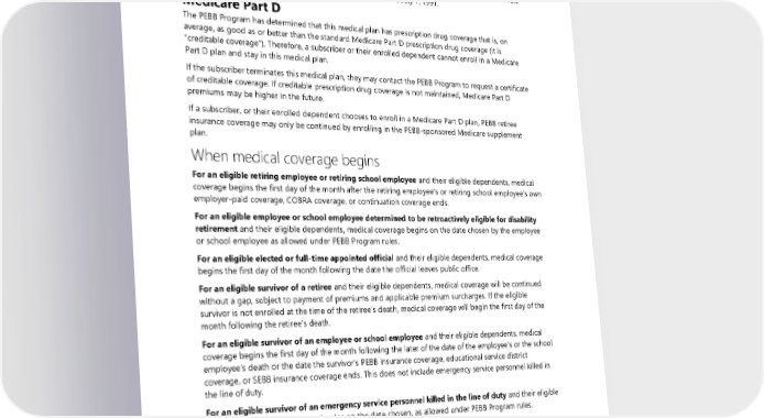 A subscriber must provide a copy of their or their dependent’s Medicare card or entitlement letter from the Social Security Administration with effective dates by uploading it online using Benefits 24/7 (once available) or providing it to the PEBB Program. If a subscriber or their dependent is not enrolled in either Medicare Part A or Part B on their 65th birthday, the subscriber must upload or provide a copy of the denial letter from the Social Security Administration. If this procedural requirement is not met, eligibility will end as described in the termination notice sent by the PEBB Program. The only exception to this rule is for an employee or school employee who retired on or before July 1, 1991. Medicare Part D The PEBB Program has determined that this medical plan has prescription drug coverage that is, on average, as good as or better than the standard Medicare Part D prescription drug coverage (it is “creditable coverage”). Therefore, a subscriber or their enrolled dependent cannot enroll in a Medicare Part D plan and stay in this medical plan. If the subscriber terminates this medical plan, they may contact the PEBB Program to request a certificate of creditable coverage. If creditable prescription drug coverage is not maintained, Medicare Part D premiums may be higher in the future. If a subscriber, or their enrolled dependent chooses to enroll in a Medicare Part D plan, PEBB retiree insurance coverage may only be continued by enrolling in the PEBB-sponsored Medicare supplement plan. When medical coverage begins For an eligible retiring employee or retiring school employee and their eligible dependents, medical coverage begins the first day of the month after the retiring employee’s or retiring school employee’s own employer-paid coverage, COBRA coverage, or continuation coverage ends. For an eligible employee or school employee determined to be retroactively eligible for disability retirement and their eligible dependents, medical coverage begins on the date chosen by the employee or school employee as allowed under PEBB Program rules. For an eligible elected or full-time appointed official and their eligible dependents, medical coverage begins the first day of the month following the date the official leaves public office. For an eligible survivor of a retiree and their eligible dependents, medical coverage will be continued without a gap, subject to payment of premiums and applicable premium surcharges. If the eligible survivor is not enrolled at the time of the retiree’s death, medical coverage will begin the first day of the month following the retiree’s death. For an eligible survivor of an employee or school employee and their eligible dependents, medical coverage begins the first day of the month following the later of the date of the employee’s or the school employee’s death or the date the survivor’s PEBB insurance coverage, educational service district coverage, or SEBB insurance coverage ends. This does not include emergency service personnel killed in the line of duty. For an eligible survivor of an emergency service personnel killed in the line of duty and their eligible dependents, medical coverage begins on the date chosen, as allowed under PEBB Program rules. For a retiree or a survivor who deferred enrollment and is enrolling in a PEBB retiree health plan following loss of other qualifying coverage, medical coverage for the retiree or the survivor and their eligible dependents begins the first day of the month after the loss of the other qualifying coverage. For a retiree, a survivor, or their eligible dependents enrolling during the PEBB Program’s annual open enrollment, medical coverage begins January 1 of the following year. 160 2024 UMP Plus–PSHVN (PEBB) Certificate of Coverage