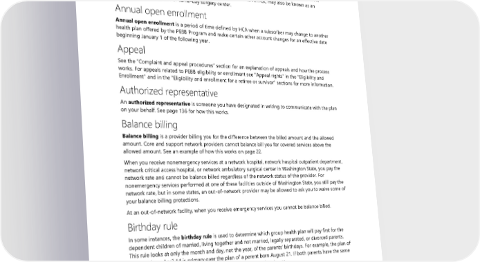 Ambulatory surgery center (ASC) An ambulatory surgery center (ASC) is a health care facility that specializes in providing surgery, pain management, and certain diagnostic services in an outpatient setting. ASC-qualified procedures are typically more complex than those done in a doctor’s office but not so complex as to require an overnight stay. Procedures commonly performed in these centers include colonoscopies, endoscopies, cataract surgery, orthopedic, and ENT (ear, nose, and throat) procedures. An ASC may also be known as an outpatient surgery center or same-day surgery center. Annual open enrollment Annual open enrollment is a period of time defined by HCA when a subscriber may change to another health plan offered by the PEBB Program and make certain other account changes for an effective date beginning January 1 of the following year. Appeal See the “Complaint and appeal procedures” section for an explanation of appeals and how the process works. For appeals related to PEBB eligibility or enrollment see "Appeal rights" in the "Eligibility and Enrollment" and in the “Eligibility and enrollment for a retiree or survivor” sections for more information. Authorized representative An authorized representative is someone you have designated in writing to communicate with the plan on your behalf. See page 136 for how this works. Balance billing Balance billing is a provider billing you for the difference between the billed amount and the allowed amount. Core and support network providers cannot balance bill you for covered services above the allowed amount. See an example of how this works on page 22. When you receive nonemergency services at a network hospital, network hospital outpatient department, network critical access hospital, or network ambulatory surgical center in Washington State, you pay the network rate and cannot be balance billed regardless of the network status of the provider. For nonemergency services performed at one of these facilities outside of Washington State, you still pay the network rate, but in some states, an out-of-network provider may be allowed to ask you to waive some of your balance billing protections. At an out-of-network facility, when you receive emergency services you cannot be balance billed. Birthday rule In some instances, the birthday rule is used to determine which group health plan will pay first for the dependent children of married, living together and not married, legally separated, or divorced parents. This rule looks at only the month and day, not the year, of the parents’ birthdays. For example, the plan of a parent born April 14 is primary over the plan of a parent born August 21. If both parents have the same birthday, the plan that has covered either parent the longest is primary. Biosimilar A biosimilar, or biosimilar drug, is a medicine approved by the US Food and Drug Administration that is highly similar in structure to and has no clinical difference to a reference biologic medicine. 170 2024 UMP Plus–PSHVN (PEBB) Certificate of Coverage