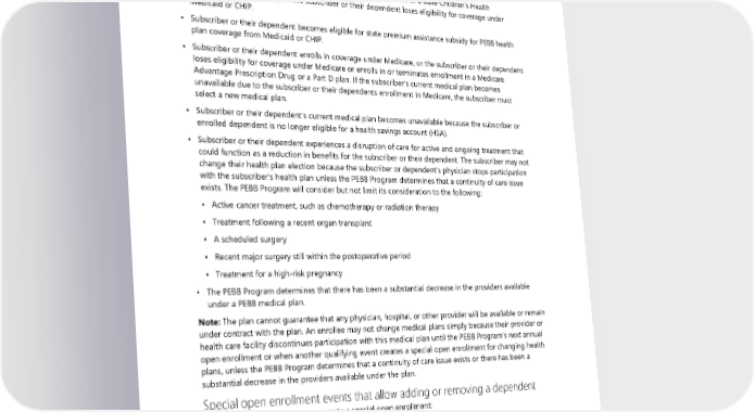 not elect a new medical plan as required, they will be enrolled in a PEBB medical plan designated by the director of HCA or their designee. • A court order requires the subscriber or any other individual to provide insurance coverage for an eligible dependent of the subscriber (a former spouse or former state-registered domestic partner is not an eligible dependent). • Subscriber or their dependent enrolls in coverage under Medicaid or a state Children’s Health Insurance Program (CHIP), or the subscriber or their dependent loses eligibility for coverage under Medicaid or CHIP. • Subscriber or their dependent becomes eligible for state premium assistance subsidy for PEBB health plan coverage from Medicaid or CHIP. • Subscriber or their dependent enrolls in coverage under Medicare, or the subscriber or their dependent loses eligibility for coverage under Medicare or enrolls in or terminates enrollment in a Medicare Advantage Prescription Drug or a Part D plan. If the subscriber’s current medical plan becomes unavailable due to the subscriber or their dependents enrollment in Medicare, the subscriber must select a new medical plan. • Subscriber or their dependent’s current medical plan becomes unavailable because the subscriber or enrolled dependent is no longer eligible for a health savings account (HSA). • Subscriber or their dependent experiences a disruption of care for active and ongoing treatment that could function as a reduction in benefits for the subscriber or their dependent. The subscriber may not change their health plan election because the subscriber or dependent’s physician stops participation with the subscriber’s health plan unless the PEBB Program determines that a continuity of care issue exists. The PEBB Program will consider but not limit its consideration to the following: ▪ Active cancer treatment, such as chemotherapy or radiation therapy ▪ Treatment following a recent organ transplant ▪ A scheduled surgery ▪ Recent major surgery still within the postoperative period ▪ Treatment for a high-risk pregnancy ▪ The PEBB Program determines that there has been a substantial decrease in the providers available under a PEBB medical plan. Note: The plan cannot guarantee that any physician, hospital, or other provider will be available or remain under contract with the plan. An enrollee may not change medical plans simply because their provider or health care facility discontinues participation with this medical plan until the PEBB Program’s next annual open enrollment or when another qualifying event creates a special open enrollment for changing health plans, unless the PEBB Program determines that a continuity of care issue exists or there has been a substantial decrease in the providers available under the plan. Special open enrollment events that allow adding or removing a dependent Any of the following events may create a special open enrollment: • Subscriber gains a new dependent due to: ▪ Marriage or registering a state-registered domestic partnership. ▪ Birth, adoption, or when the subscriber has assumed a legal obligation for total or partial support in anticipation of adoption. ▪ A child becoming eligible as an extended dependent through legal custody or legal guardianship. 2024 UMP Plus–PSHVN (PEBB) Certificate of Coverage 165