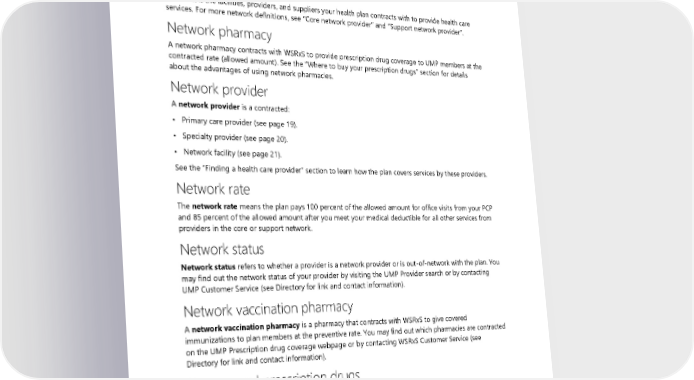 Necessary contact lenses Necessary contact lenses are contact lenses that are prescribed by your provider for other than elective or cosmetic purposes. Necessary contact lenses are used to treat specific conditions for which contact lenses provide better visual correction. Network Network is the facilities, providers, and suppliers your health plan contracts with to provide health care services. For more network definitions, see “Core network provider” and “Support network provider”. Network pharmacy A network pharmacy contracts with WSRxS to provide prescription drug coverage to UMP members at the contracted rate (allowed amount). See the “Where to buy your prescription drugs” section for details about the advantages of using network pharmacies. Network provider A network provider is a contracted: • Primary care provider (see page 19). • Specialty provider (see page 20). • Network facility (see page 21). See the “Finding a health care provider” section to learn how the plan covers services by these providers. Network rate The network rate means the plan pays 100 percent of the allowed amount for office visits from your PCP and 85 percent of the allowed amount after you meet your medical deductible for all other services from providers in the core or support network. Network status Network status refers to whether a provider is a network provider or is out-of-network with the plan. You may find out the network status of your provider by visiting the UMP Provider search or by contacting UMP Customer Service (see Directory for link and contact information). Network vaccination pharmacy A network vaccination pharmacy is a pharmacy that contracts with WSRxS to give covered immunizations to plan members at the preventive rate. You may find out which pharmacies are contracted on the UMP Prescription drug coverage webpage or by contacting WSRxS Customer Service (see Directory for link and contact information). Noncovered prescription drugs Noncovered prescription drugs refer to any drug that is only covered if the member receives an exception from the plan. Some drugs may be medically necessary, yet still are not covered. See the "Prescription drugs and products UMP does not cover" section. 2024 UMP Plus–PSHVN (PEBB) Certificate of Coverage 181