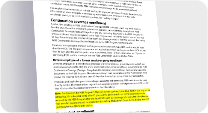 If the employee does not enroll online or return the form by the deadline, the employee will be enrolled in Uniform Medical Plan Classic and a tobacco use premium surcharge will be incurred. Consequently, dependents cannot be enrolled until the PEBB Program’s next annual open enrollment or when a qualifying event occurs that creates a special open enrollment for enrolling a dependent. Waiving medical enrollment An eligible employee may waive enrollment in PEBB medical if they are enrolled in other employer-based group medical, a TRICARE plan, or Medicare. They may not waive enrollment in PEBB medical if they are enrolled in PEBB retiree insurance coverage. When a retiree becomes eligible for the employer contribution toward PEBB benefits, PEBB retiree insurance coverage will be automatically deferred. If an employee waives enrollment in PEBB medical, the employee cannot enroll eligible dependents. For information on when an eligible employee may waive medical plan enrollment after their initial enrollment period, or to enroll after having waived, see “Making changes.” Continuation coverage enrollment A subscriber enrolling in PEBB Continuation Coverage (COBRA or Unpaid Leave) may enroll by using Benefits 24/7, the online enrollment system (once available), or by submitting the applicable PEBB Continuation Coverage Election/Change form and any supporting documents to the PEBB Program. The online enrollment must be completed or the PEBB Program must receive the election form no later than 60 days from the date the enrollee’s PEBB health plan coverage ended or from the postmark date on the PEBB Continuation Coverage Election Notice sent by the PEBB Program, whichever is later. Premiums and applicable premium surcharges associated with continuing PEBB medical must be made directly to HCA. The first premium payment and applicable premium surcharges are due to HCA no later than 45 days after the election period ends as described above. For more information, see “Options for continuing PEBB medical coverage” and the PEBB Continuation Coverage Election Notice. Retired employee of a former employer group enrollment A retired employee or a retired school employee of a former employer group may enroll and self-pay premiums using Benefits 24/7, the online enrollment system (once available), or by submitting the PEBB Continuation Coverage (Employer Group Ended Participation) Election/Change form and any supporting documents to the PEBB Program. The online enrollment must be completed or the PEBB Program must receive the required form no later than 60 days after the employer group ended their participation. Premiums and applicable premium surcharges associated with continuing PEBB medical must be made directly to HCA. The first premium payment and applicable premium surcharges are due to HCA no later than 45 days after the election period ends as described above. Note: Enrollment in the PEBB Program’s Medicare Advantage Prescription Drug (MAPD) plan may not be retroactive. If a subscriber elects a MAPD plan and the online enrollment or the required forms are received by the PEBB Program after the date PEBB health plan coverage is to begin, the subscriber and their enrolled dependents will be enrolled in the Uniform Medical Plan Classic during the gap month(s) prior to when the MAPD plan begins. Dependent enrollment To enroll an eligible dependent, the subscriber must include the dependent’s information online using Benefits 24/7 (once available) or on the applicable enrollment form and provide the required document(s) as proof of the dependent’s eligibility. The dependent will not be enrolled in PEBB health plan coverage if the PEBB Program or the employing agency is unable to verify their eligibility within the PEBB Program enrollment timelines. 142 2024 UMP Plus–PSHVN (PEBB) Certificate of Coverage