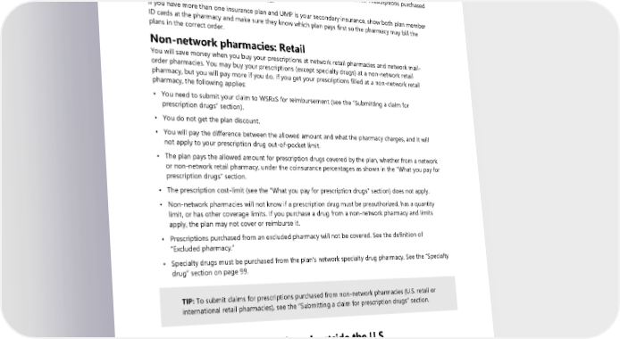 How to get the plan discount Be sure to fill your prescriptions at a network pharmacy and show your ID card at the pharmacy counter. If you do, you pay for covered prescription drugs based on the allowed amount (WSRxS’ standard reimbursement). If you do not show your UMP member ID card at a network pharmacy or you use a non- network pharmacy, then you may be charged a higher amount. If the amount charged is more than the UMP allowed amount, you will pay the difference in addition to your coinsurance. Prescriptions purchased from an excluded pharmacy are not covered. If you have more than one insurance plan and UMP is your secondary insurance, show both plan member ID cards at the pharmacy and make sure they know which plan pays first so the pharmacy may bill the plans in the correct order. Non-network pharmacies: Retail You will save money when you buy your prescriptions at network retail pharmacies and network mail- order pharmacies. You may buy your prescriptions (except specialty drugs) at a non-network retail pharmacy, but you will pay more if you do. If you get your prescriptions filled at a non-network retail pharmacy, the following applies: • You need to submit your claim to WSRxS for reimbursement (see the “Submitting a claim for prescription drugs” section). • You do not get the plan discount. • You will pay the difference between the allowed amount and what the pharmacy charges, and it will not apply to your prescription drug out-of-pocket limit. • The plan pays the allowed amount for prescription drugs covered by the plan, whether from a network or non-network retail pharmacy, under the coinsurance percentages as shown in the “What you pay for prescription drugs” section. • The prescription cost-limit (see the “What you pay for prescription drugs” section) does not apply. • Non-network pharmacies will not know if a prescription drug must be preauthorized, has a quantity limit, or has other coverage limits. If you purchase a drug from a non-network pharmacy and limits apply, the plan may not cover or reimburse it. • Prescriptions purchased from an excluded pharmacy will not be covered. See the definition of “Excluded pharmacy.” • Specialty drugs must be purchased from the plan’s network specialty drug pharmacy. See the “Specialty drug” section on page 99. TIP: To submit claims for prescriptions purchased from non-network pharmacies (U.S. retail or international retail pharmacies), see the “Submitting a claim for prescription drugs” section. Prescription drugs purchased outside the U.S. If you purchase prescription drugs outside the U.S. for any reason, the following rules apply: • If the prescription drug is available only by prescription in the U.S. but does not require one outside the U.S., the drug is covered only if prescribed by a provider practicing within their scope of practice. • If you get a prescription drug that is approved for use in another country but not in the U.S., the plan will not cover it. 96 2024 UMP Plus–PSHVN (PEBB) Certificate of Coverage
